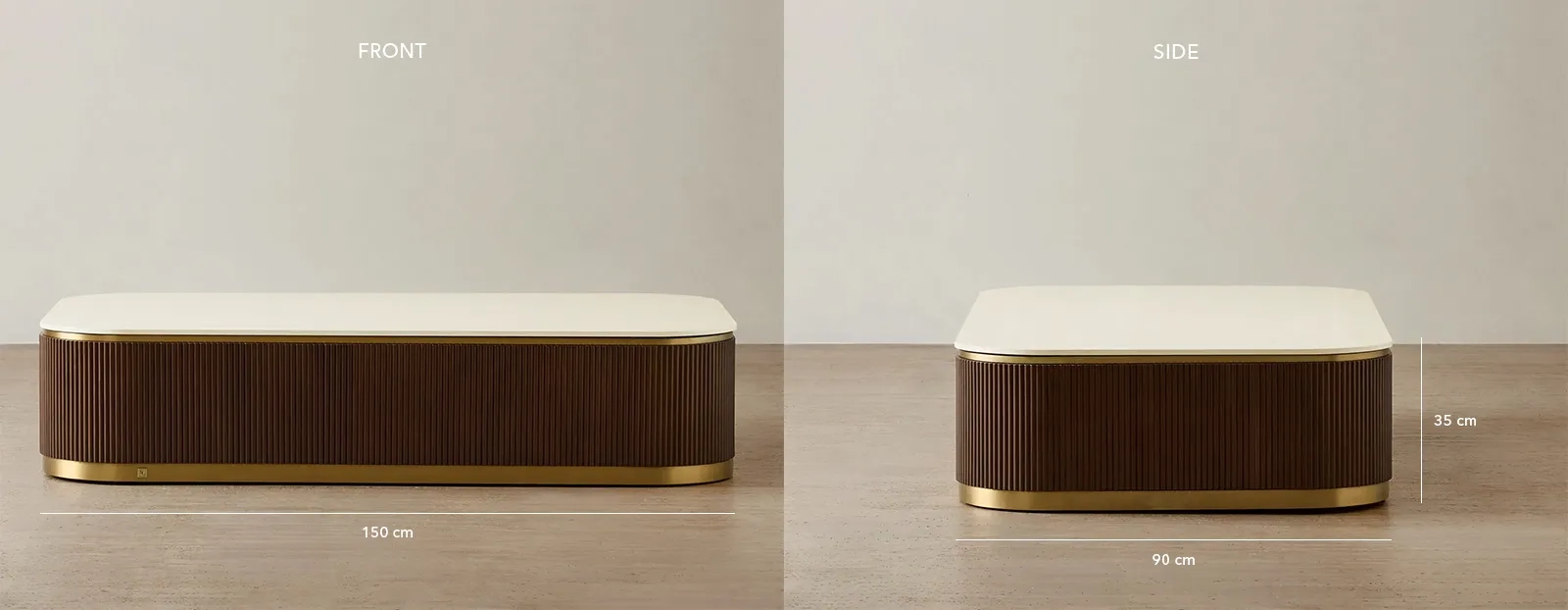 The body features rich ebony brown ash veneer with elegant vertical reeding, adding texture, rhythm, and architectural depth. Accented by warm tones and a subtle golden base trim, the San Pierre harmonizes natural hues.