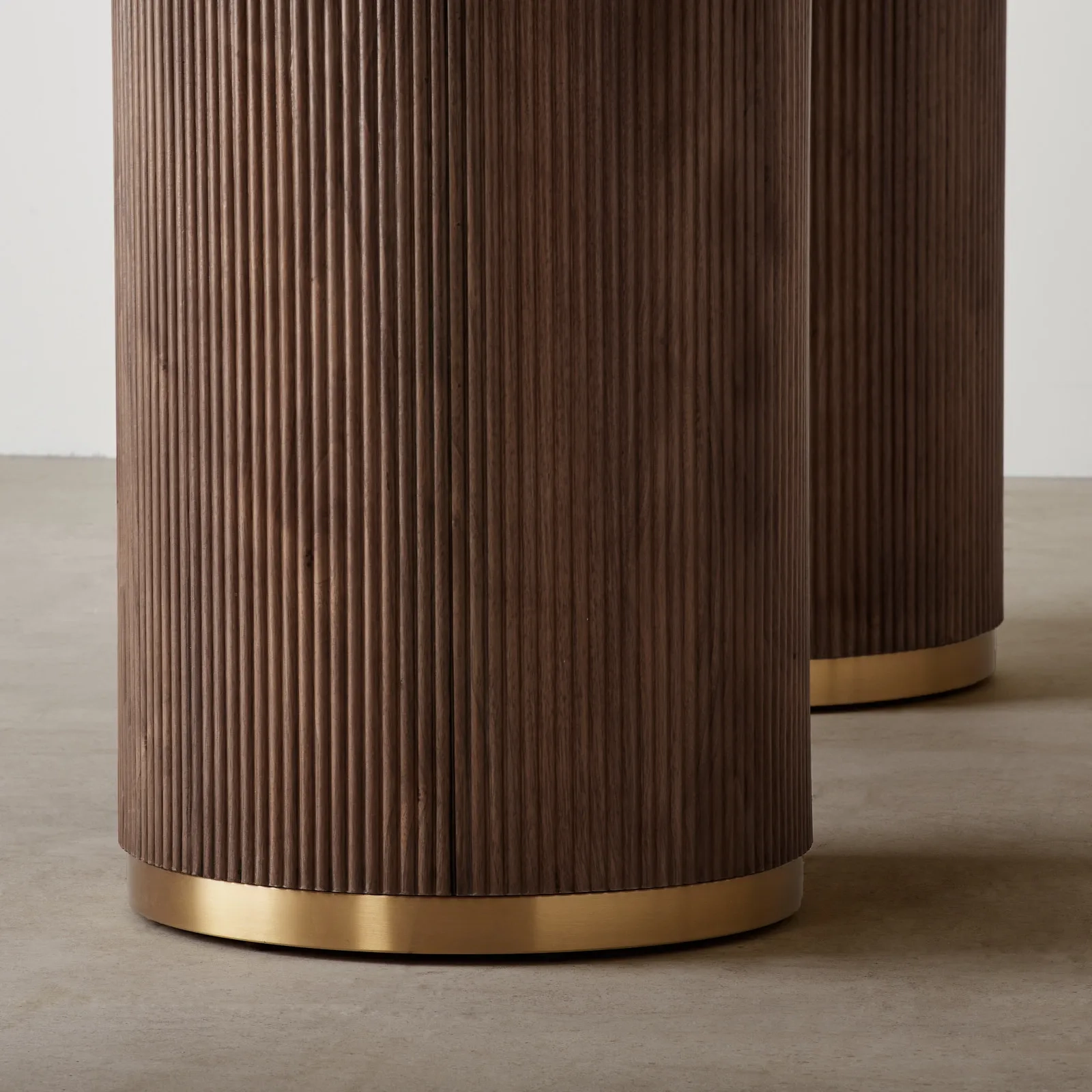 Through the San Pierre collection, Koala Living showcases Emily McAlister's unique ability to draw inspiration from the past and seamlessly integrate it into modern design, creating pieces that are both timeless and contemporary. During her travels through ancient streets, Emily was mesmerized by the vibrant fusion of history and modernity. Inspired by towering columns, intricate metalwork, and enchanting aromas, she meticulously wove these elements into the San Pierre collection. Each table in this collection features a sintered stone top with a travertine finish, beautifully reflecting the timeless charm of aged architecture. The base of each table, designed with walnut veneer creating vertical reeding, adds a dynamic and sophisticated presence. Emily's design philosophy places a strong emphasis on functionality and human connection. This is evident in the San Pierre collection, where each piece is crafted to enhance everyday moments and bring a touch of elegance to any space. The well-crafted tables in the collection are not only visually stunning but also highly practical, embodying Emily's vision of creating designs that are both beautiful and useful.
