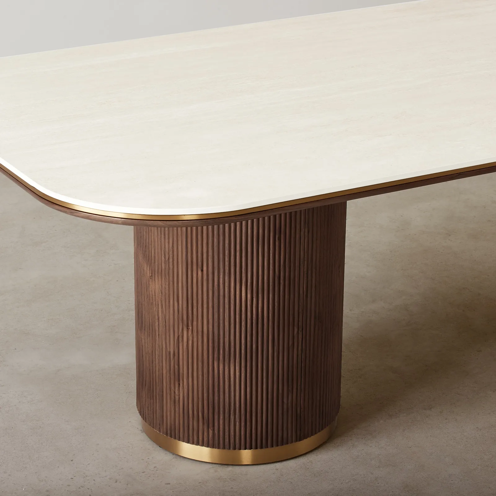 Through the San Pierre collection, Koala Living showcases Emily McAlister's unique ability to draw inspiration from the past and seamlessly integrate it into modern design, creating pieces that are both timeless and contemporary. During her travels through ancient streets, Emily was mesmerized by the vibrant fusion of history and modernity. Inspired by towering columns, intricate metalwork, and enchanting aromas, she meticulously wove these elements into the San Pierre collection. Each table in this collection features a sintered stone top with a travertine finish, beautifully reflecting the timeless charm of aged architecture. The base of each table, designed with walnut veneer creating vertical reeding, adds a dynamic and sophisticated presence. Emily's design philosophy places a strong emphasis on functionality and human connection. This is evident in the San Pierre collection, where each piece is crafted to enhance everyday moments and bring a touch of elegance to any space. The well-crafted tables in the collection are not only visually stunning but also highly practical, embodying Emily's vision of creating designs that are both beautiful and useful.