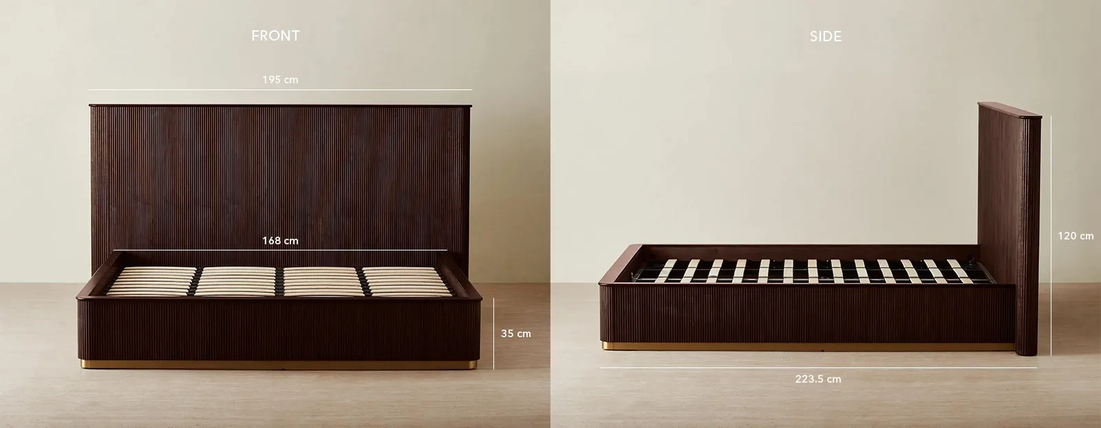 The sturdy frame and supportive slat system ensure durability and comfort for a restful night’s sleep. A subtle brass base accent provides a refined touch to complete the design.
