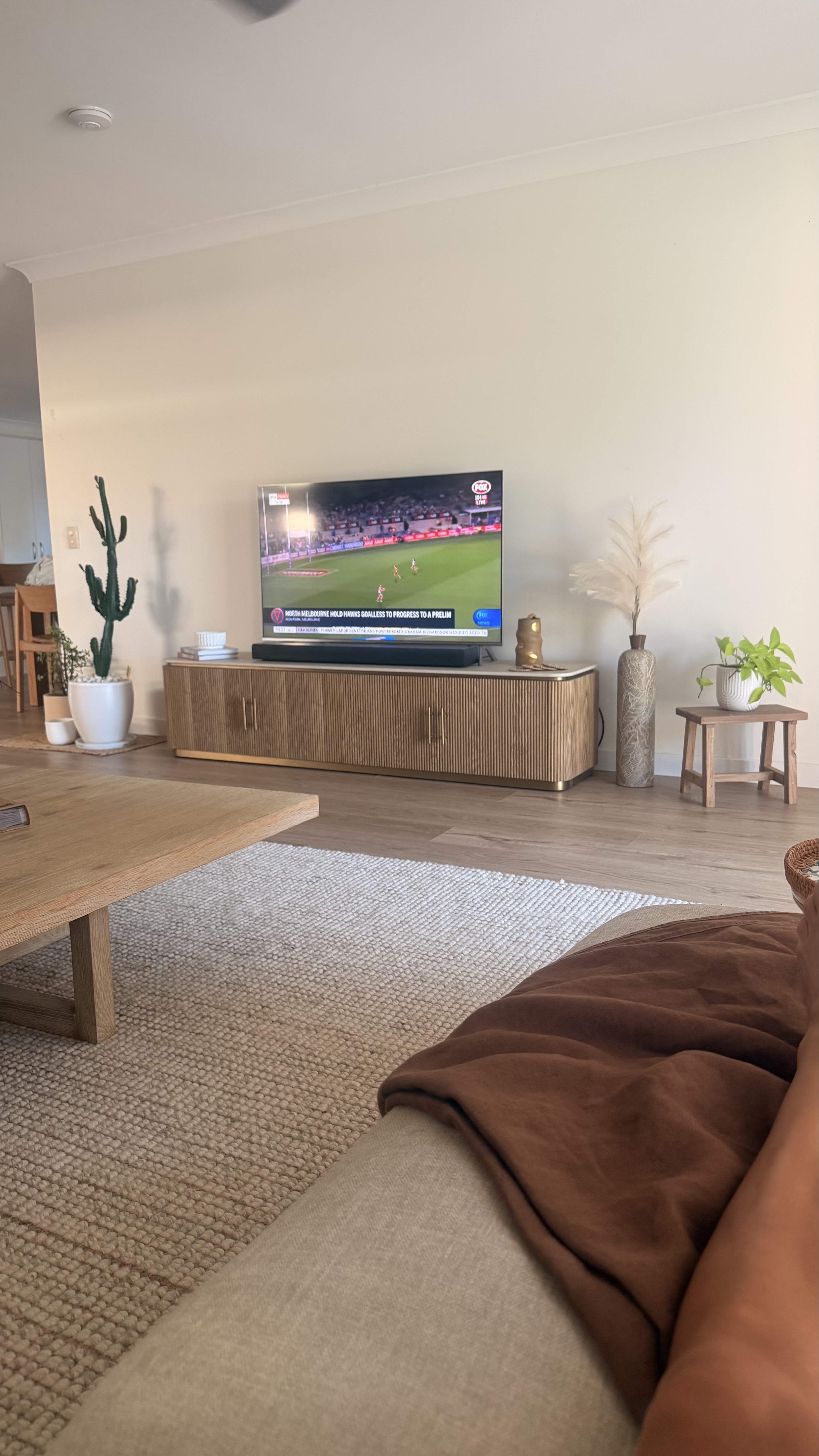 The Light Brown Ash Veneer exterior with a fluted design adds visual appeal. The unit has spacious cabinets for multiple devices and built-in wire holes for easy cable management.