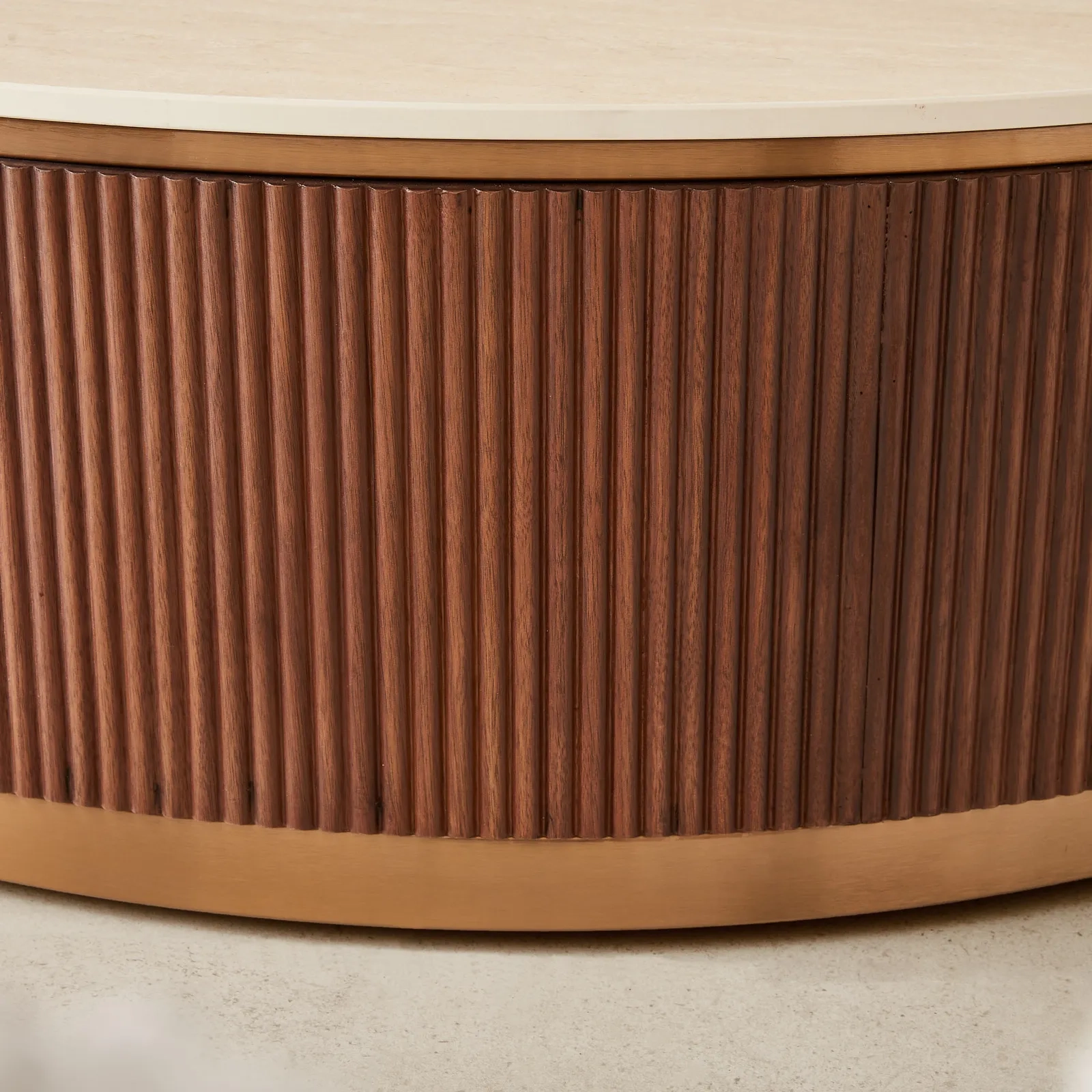 Its rounded design brings a sense of flow and unity to the living room. The warm brown hue of the walnut veneer base, accentuated by vertical reeding, perfectly complements its grandiose tabletop.