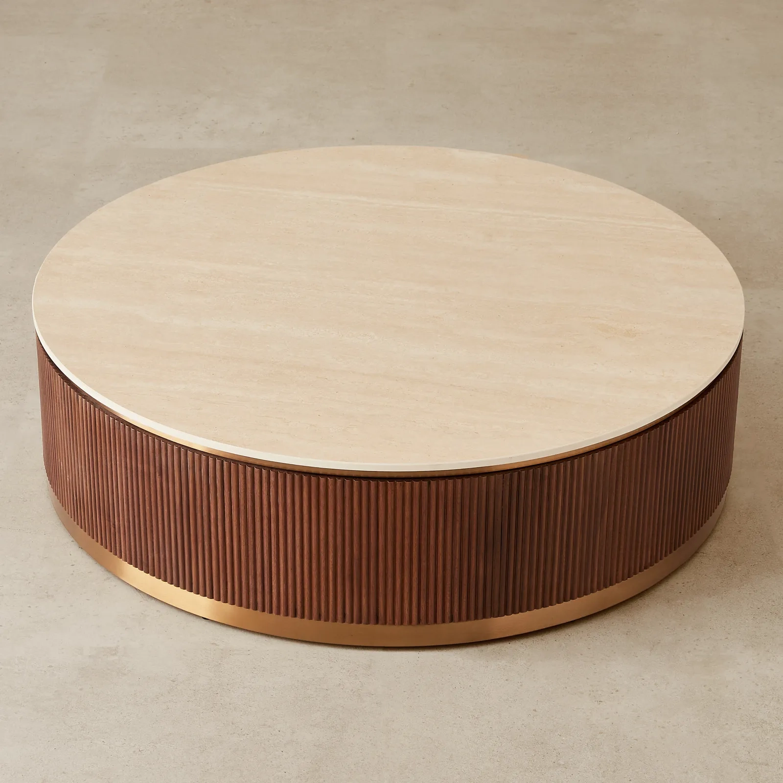 The San Pierre Walnut Veneer Coffee Table is a masterpiece of design, marrying the modern aesthetic of veneer and brass with a round sintered stone tabletop finished in high travertine.