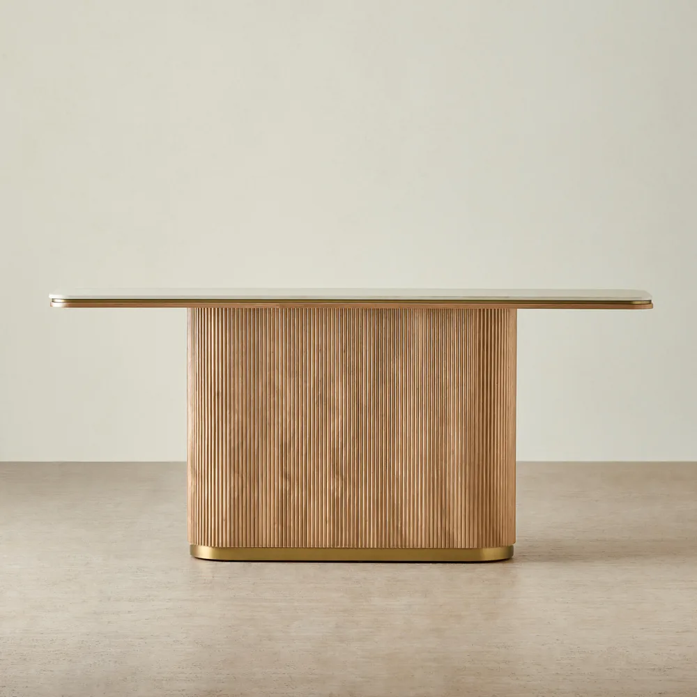 Its single walnut veneer column, finished with vertical reeding, brings texture and architectural depth. Subtle golden accents at the base enhances the table’s profile, making it a striking focal point in any entryway or living space.