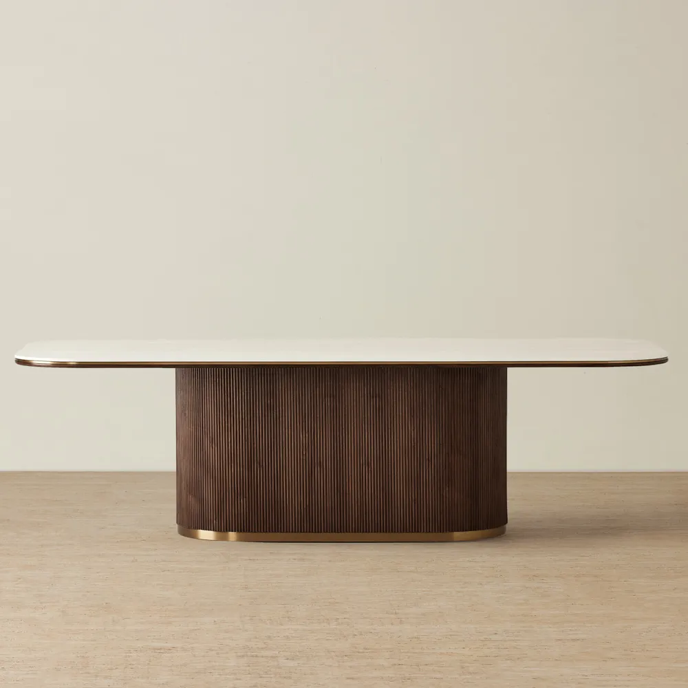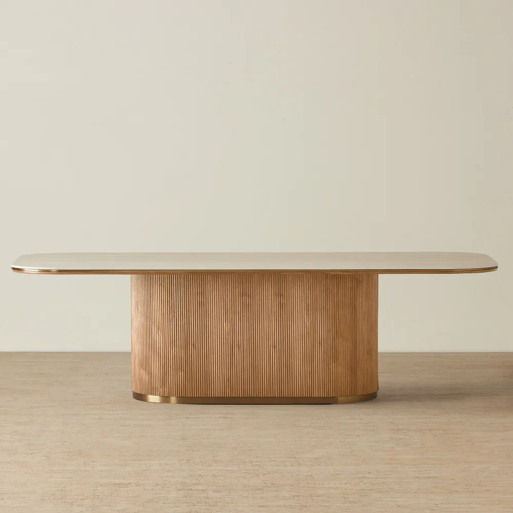 Through the San Pierre collection, Koala Living showcases Emily McAlister's unique ability to draw inspiration from the past and seamlessly integrate it into modern design, creating pieces that are both timeless and contemporary. During her travels through ancient streets, Emily was mesmerized by the vibrant fusion of history and modernity. Inspired by towering columns, intricate metalwork, and enchanting aromas, she meticulously wove these elements into the San Pierre collection. Each table in this collection features a sintered stone top with a travertine finish, beautifully reflecting the timeless charm of aged architecture. The base of each table, designed with walnut veneer creating vertical reeding, adds a dynamic and sophisticated presence. Emily's design philosophy places a strong emphasis on functionality and human connection. This is evident in the San Pierre collection, where each piece is crafted to enhance everyday moments and bring a touch of elegance to any space. The well-crafted tables in the collection are not only visually stunning but also highly practical, embodying Emily's vision of creating designs that are both beautiful and useful.
