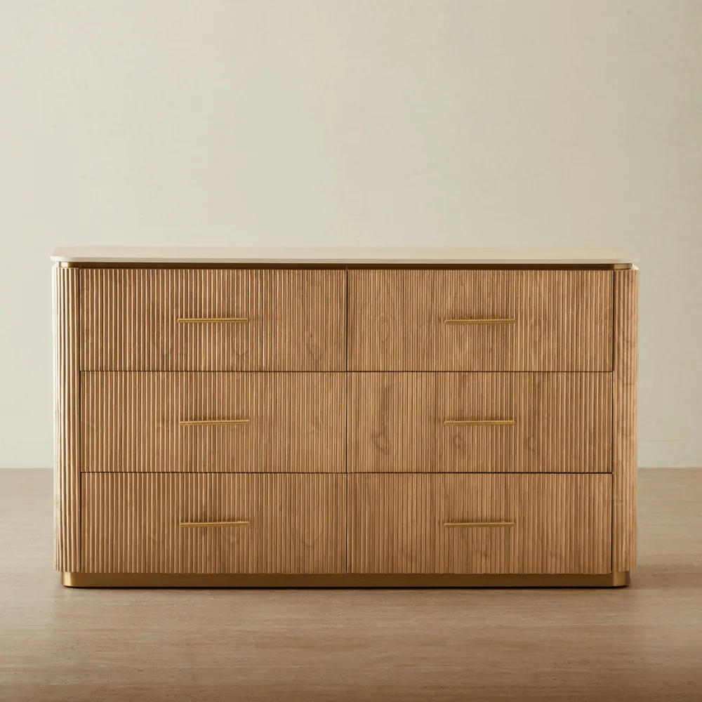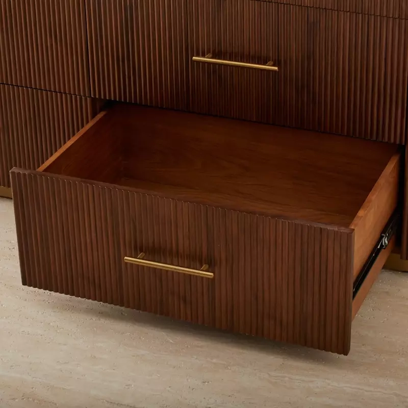 Its walnut veneer features vertical reeding, adding a gentle rhythm and texture. With roomy drawers, it’s perfect for storing everything from cozy sweaters to keepsakes.