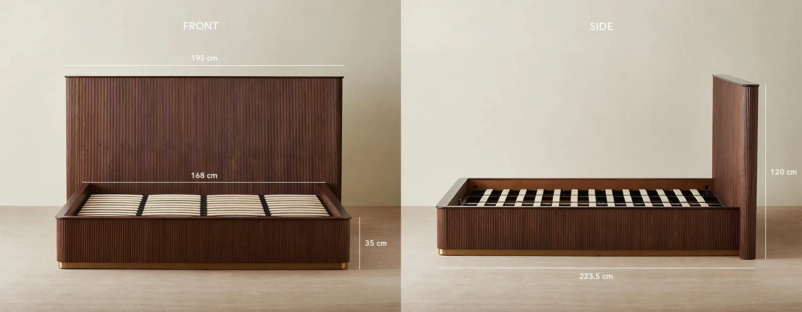 The sturdy frame and supportive slat system ensure durability and comfort for a restful night’s sleep. A subtle brass base accent provides a refined touch to complete the design.