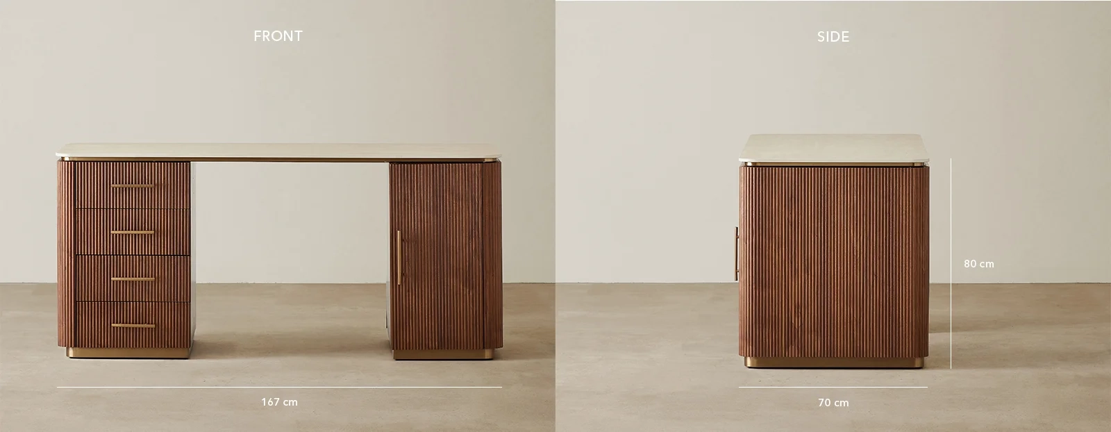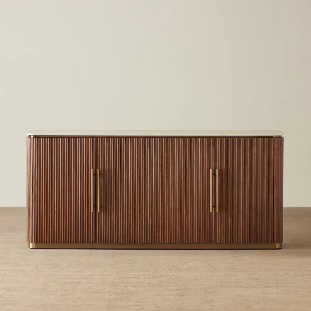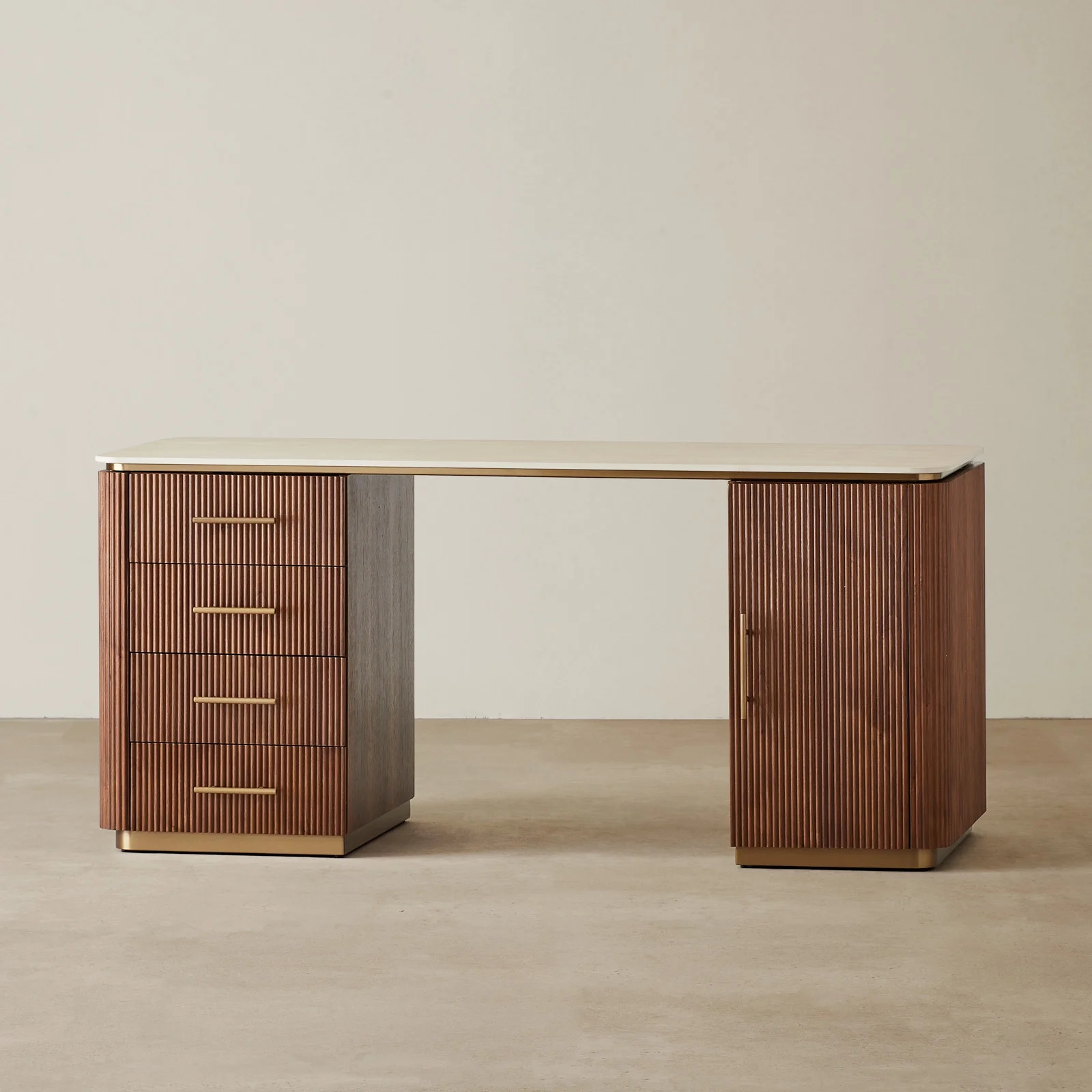 The San Pierre Study Desk features a luxurious sintered stone top with a travertine finish, perfect for work or study. Its warm walnut Veneer with a fluted design adds timeless elegance.