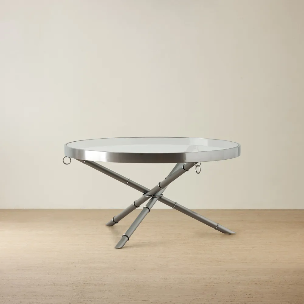 The Sandringham Coffee Table features a circular tempered glass tabletop supported by a durable golden frame and stainless-steel tripod legs with bamboo-inspired accents. It offers ample space for books, decor, or coffee, blending modern and classic styles for a versatile addition to any living room.