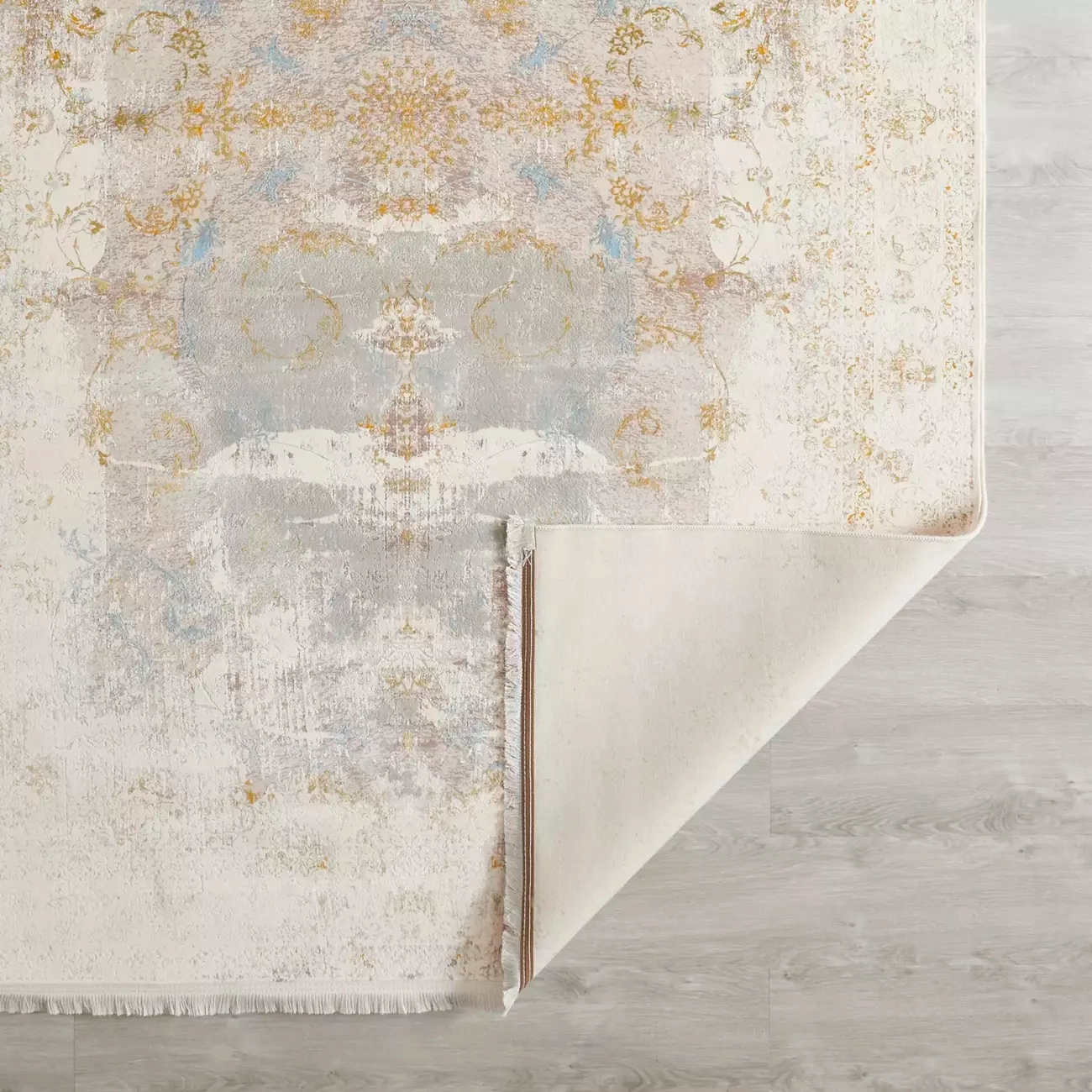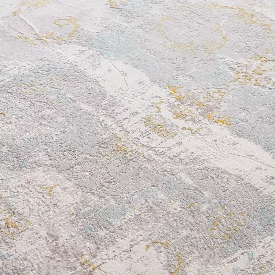 Its colour palette includes soft greys, warm golds, and hints of pastel blue. The distressed finish gives it a vintage look.