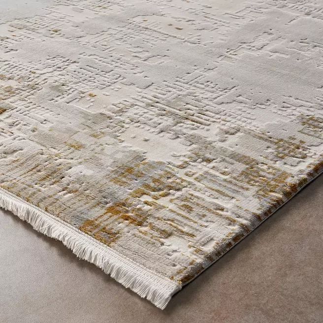 The Sarah Floor Rug features an abstract pattern in shades of gold, gray, and white, for a visually dynamic and modern look.