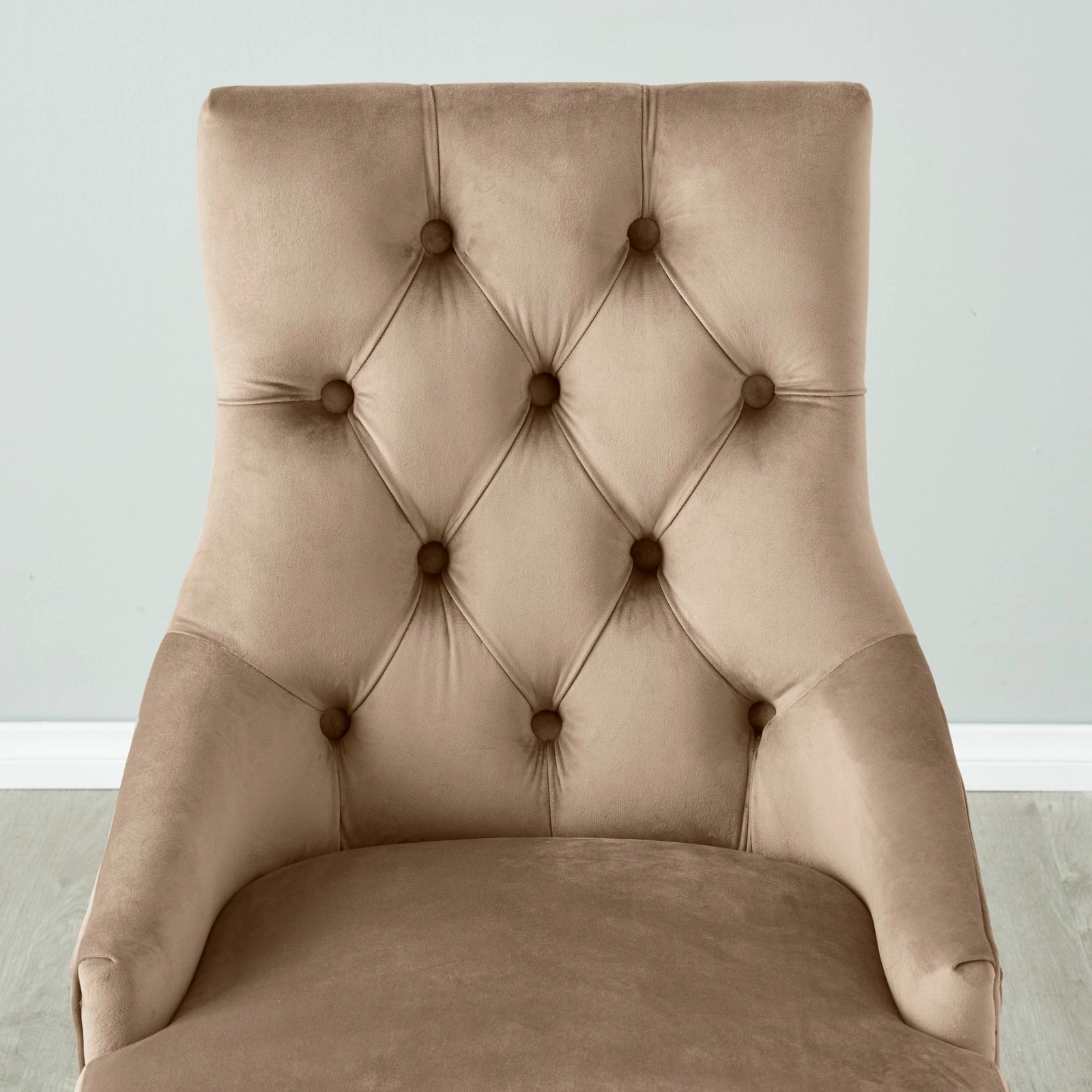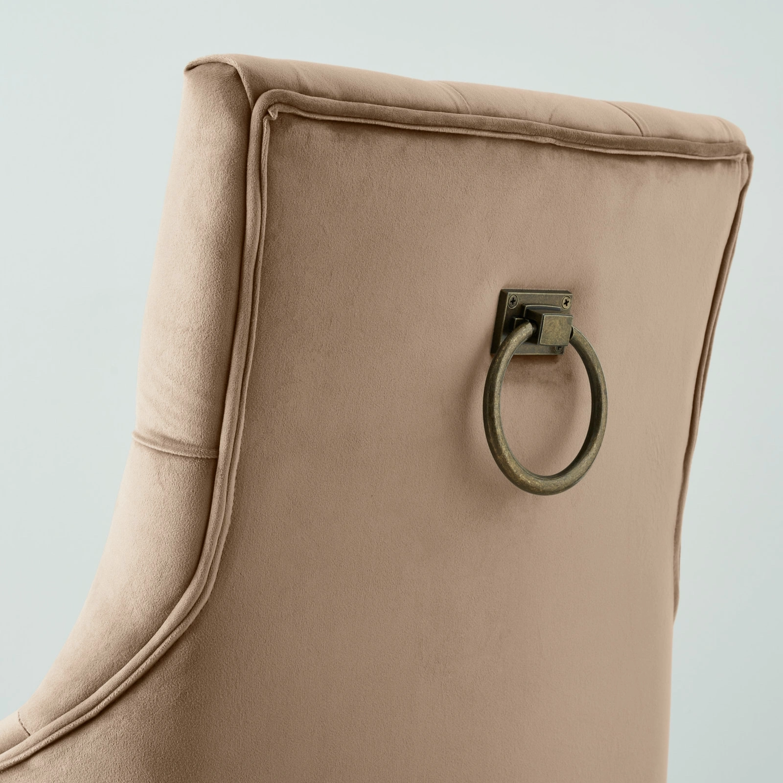 The cushioned seat provides a cozy and supportive seating experience, allowing you to enjoy meals and conversations. It features a diamond tufted backrest that not only adds a plush and luxurious feel but also contributes to the chair's stylized appearance, adding visual interest to the overall design. To further enhance its aesthetic appeal, a decorative pull ring and a row of brass studs add a touch of refinement and serves as delightful accents.
