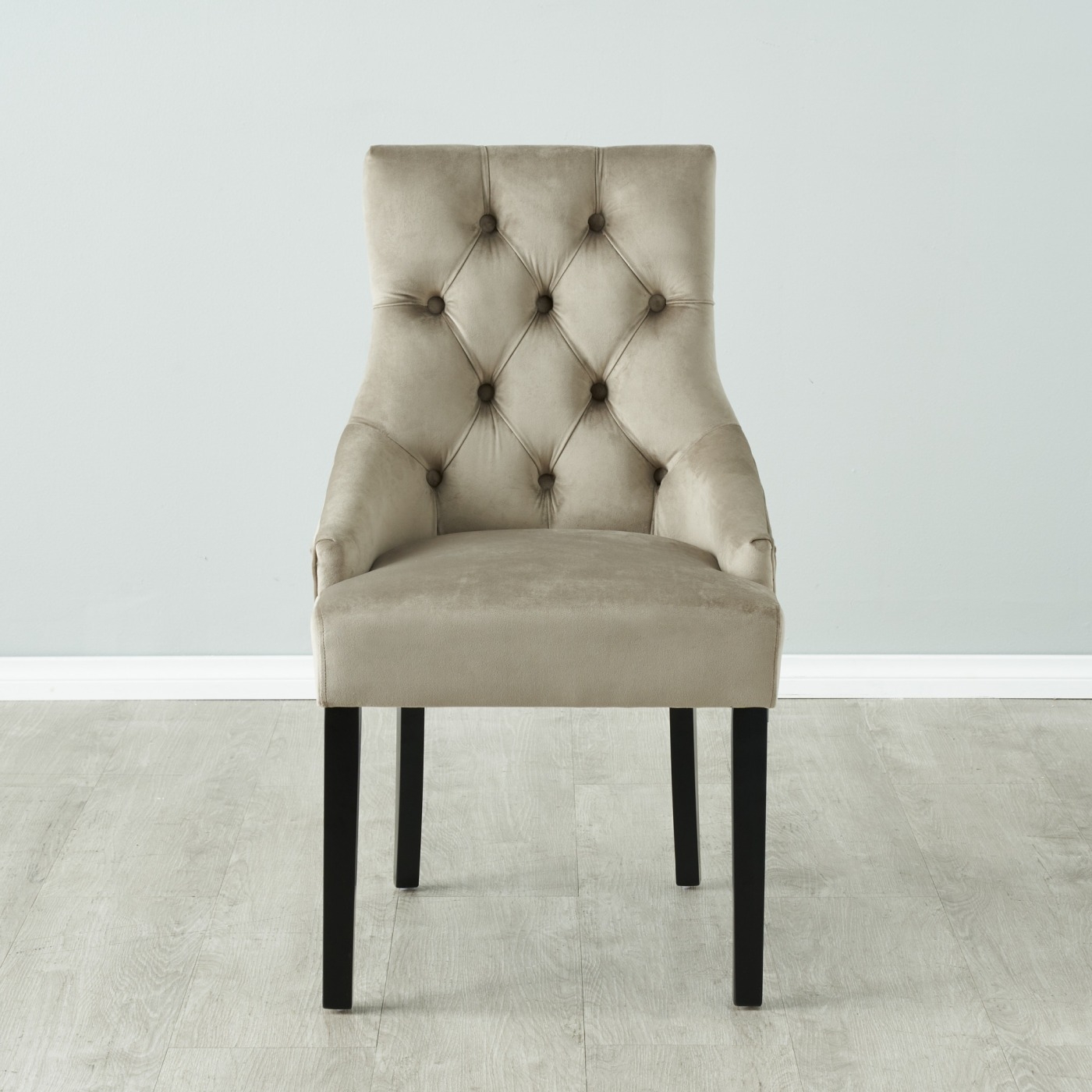 Enhance your dining space with the timeless elegance of the Saxon Beige Velvet Dining Chair. This chair embodies the perfect balance of style and comfort, creating a luxuriously inviting atmosphere with its modern cottage aesthetic. The artistically crafted wooden frame of the Saxon chair exudes a vintage charm. The timeless beige-coloured velvet upholstery complements the frame, creating a harmonious and inviting look. Experience utmost comfort as you dine with the Saxon chair's layer of dense foam padding.