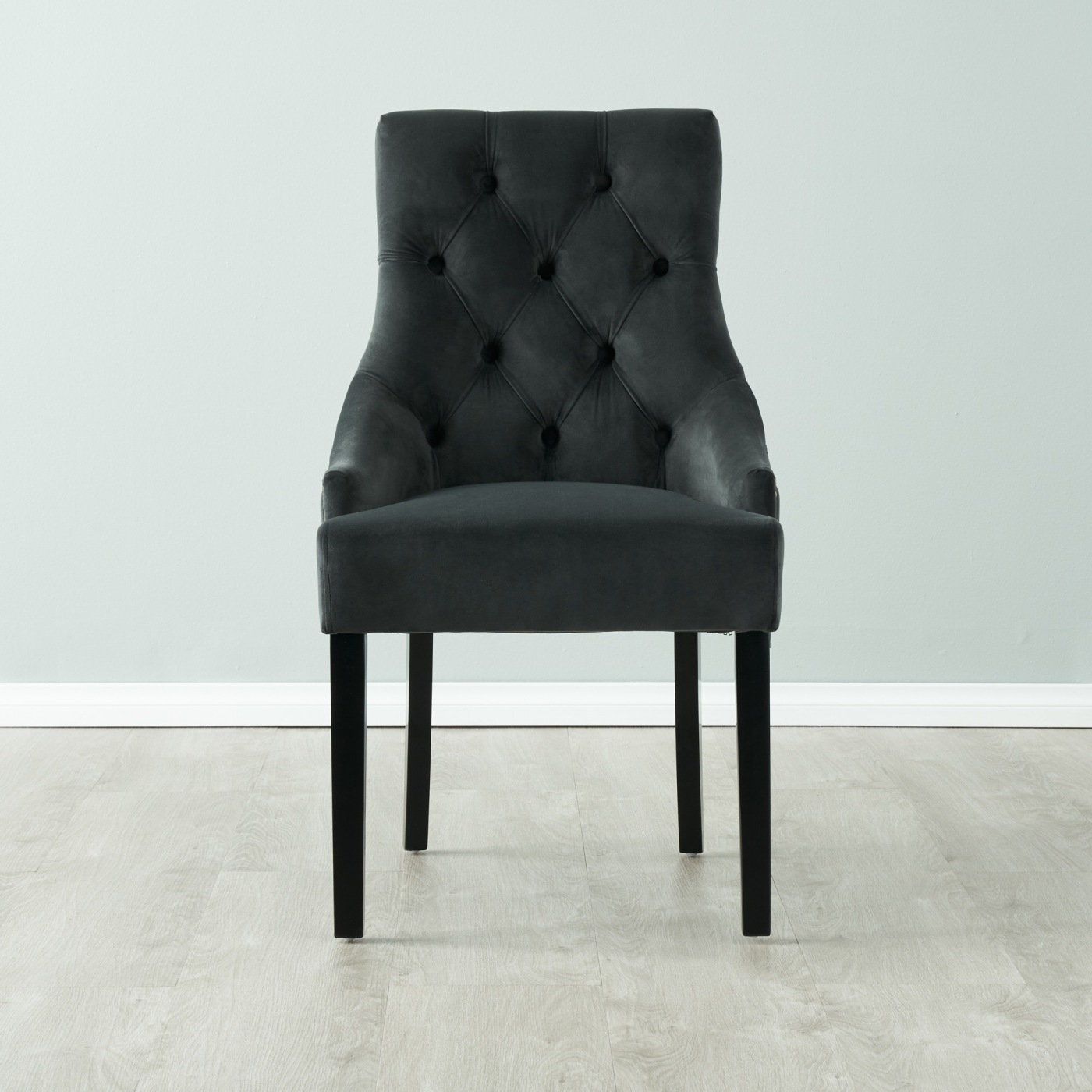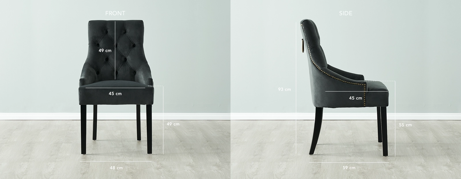 Enhance your dining space with the timeless elegance of the Saxon Charcoal Velvet Dining Chair. This chair embodies the perfect balance of style and comfort, creating a luxuriously inviting atmosphere with its modern cottage aesthetic. The artistically crafted wooden frame of the Saxon chair exudes a vintage charm. The timeless charcoal-coloured velvet upholstery complements the frame, creating a harmonious and inviting look. Experience utmost comfort as you dine with the Saxon chair's layer of dense foam padding.