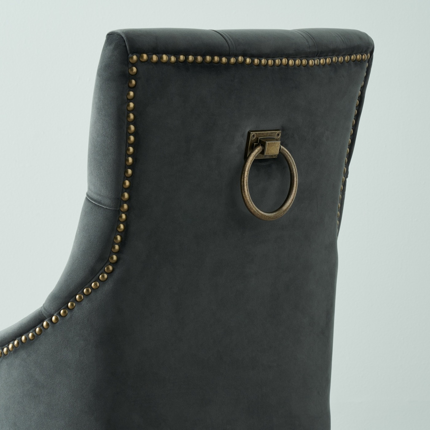 The cushioned seat provides a cozy and supportive seating experience, allowing you to enjoy meals and conversations. It features a diamond tufted backrest that not only adds a plush and luxurious feel but also contributes to the chair's stylized appearance, adding visual interest to the overall design. To further enhance its aesthetic appeal, a decorative pull ring and a row of brass studs add a touch of refinement and serves as delightful accents.