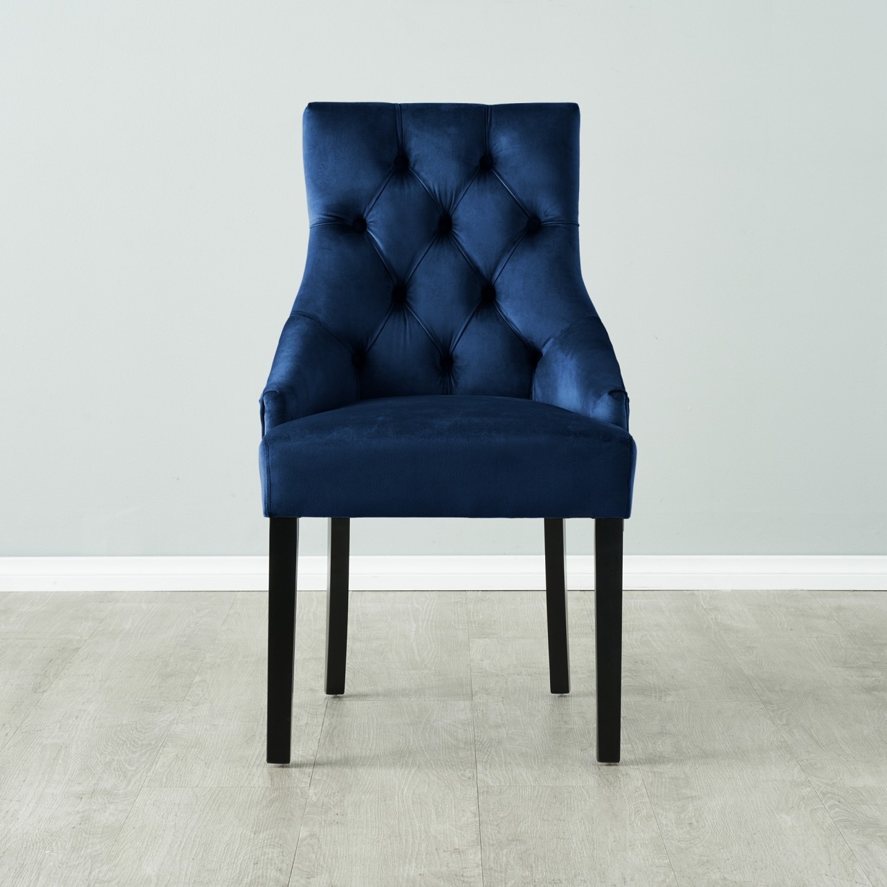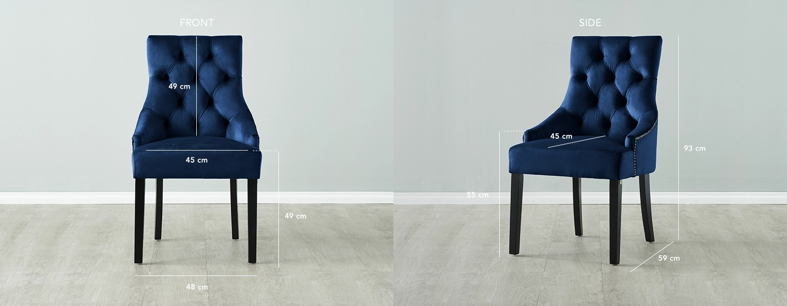 Enhance your dining space with the timeless elegance of the Saxon Navy Blue Velvet Dining Chair. This chair embodies the perfect balance of style and comfort, creating a luxuriously inviting atmosphere with its modern cottage aesthetic. The artistically crafted wooden frame of the Saxon chair exudes a vintage charm. The timeless Navy Blue-coloured velvet upholstery complements the frame, creating a harmonious and inviting look. Experience utmost comfort as you dine with the Saxon chair's layer of dense foam padding.