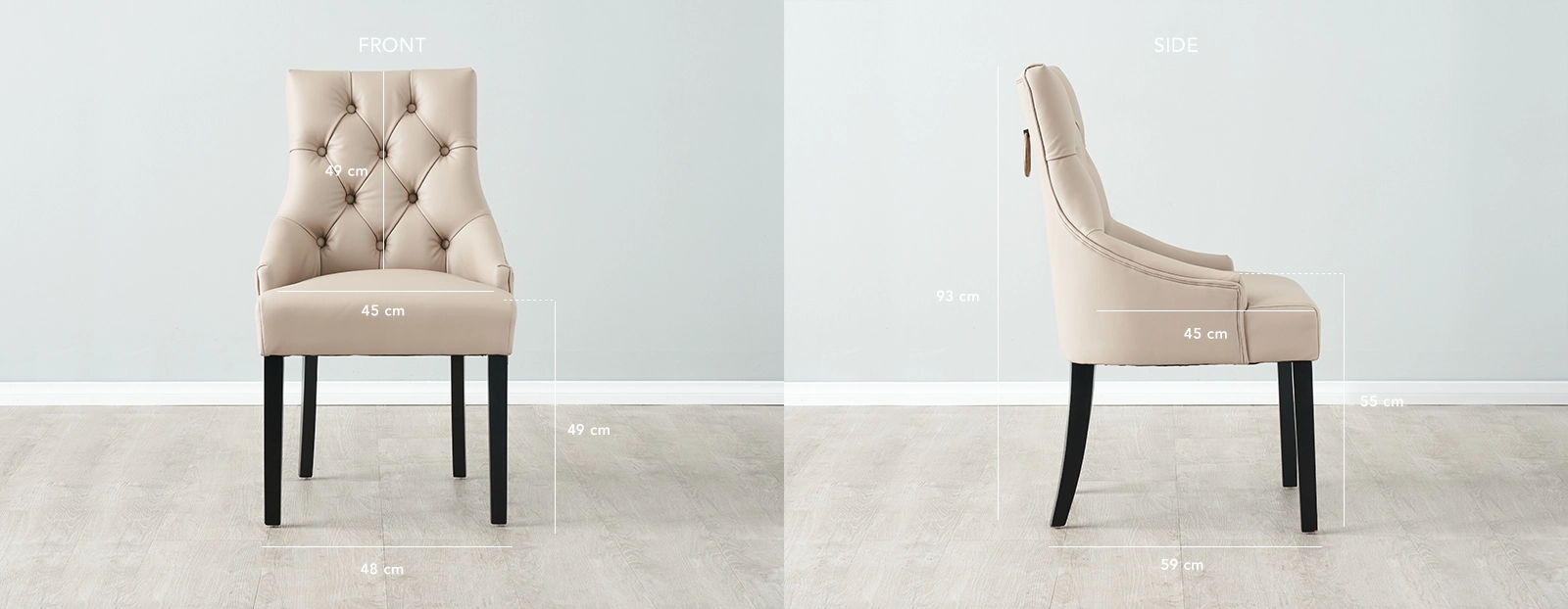 The Saxon Dining Chair blends modern craftsmanship with vintage charm, featuring premium sand beige vegan leather and a classically shaped frame.