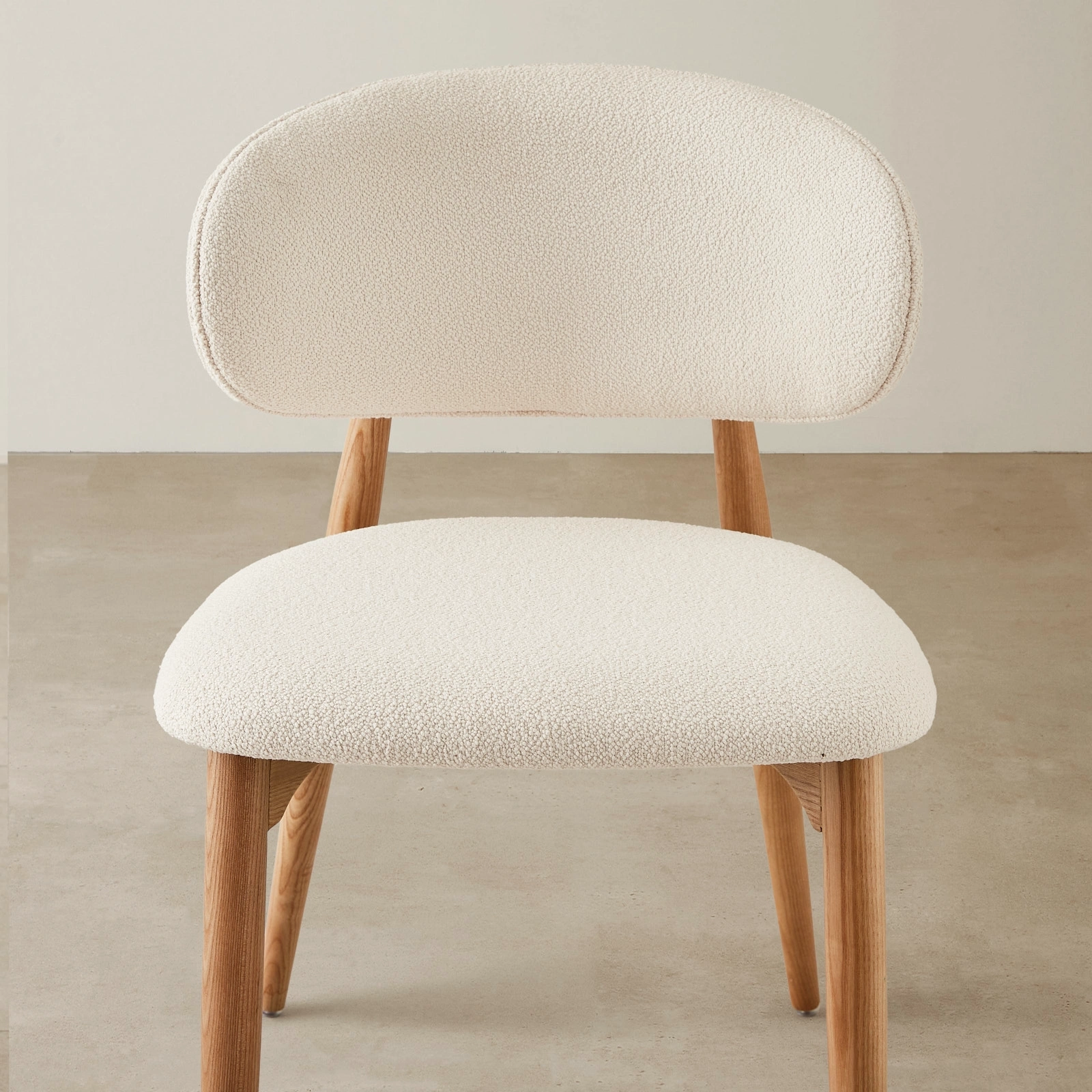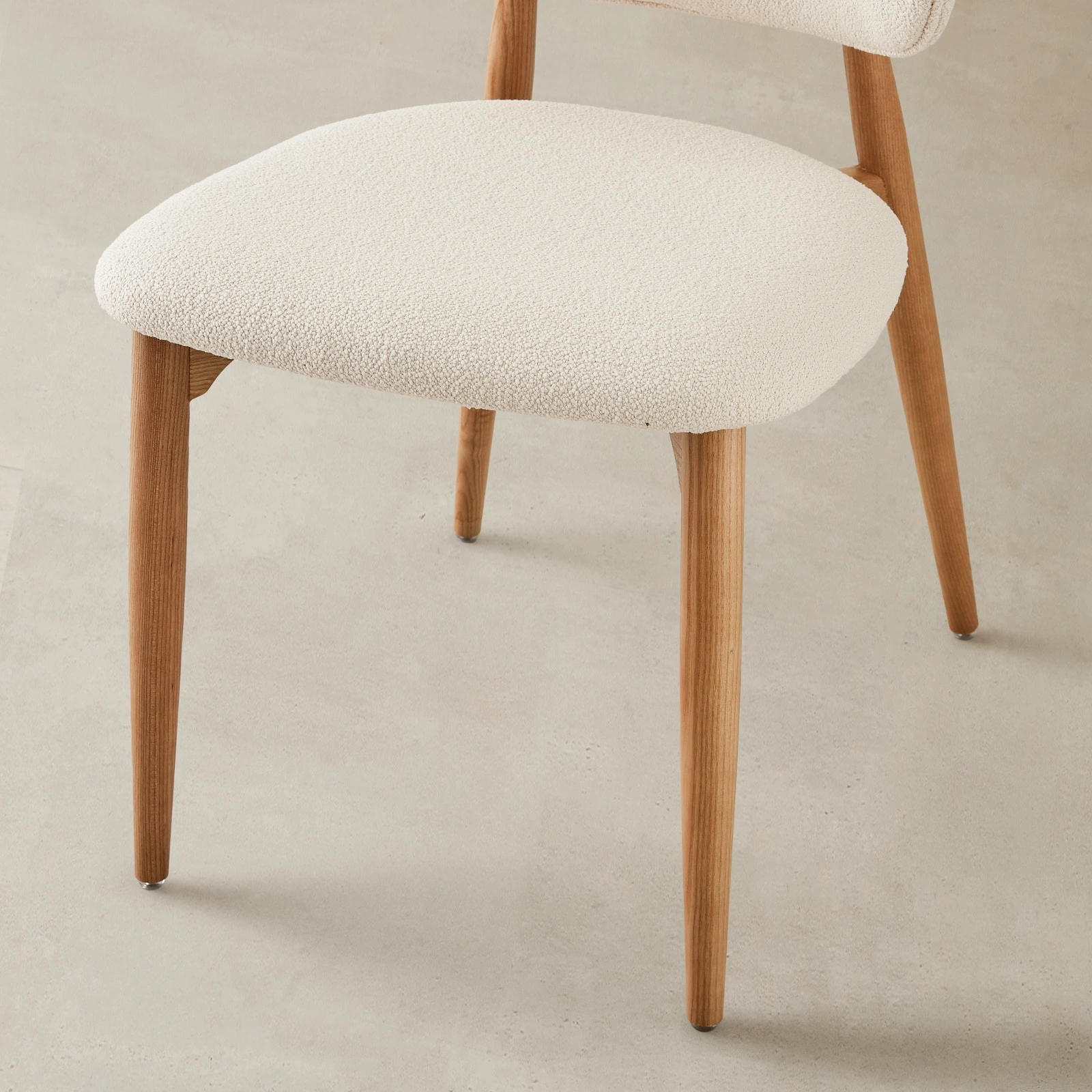 The Seville Chantilly White Fabric Dining Chair offers a sculptural addition to the dining experience, combining modern flair with mid-century sensibilities. It offers a textured experience to the tactile and visual dimensions of dining room décor. Its fabric, reminiscent of the delicate intricacy of Chantilly lace, has a distinctive knobby texture that invites touch and adds depth to its pristine white surface. This textured appeal contrasts delightfully with the sleek, light brown ash legs, creating a design that's rooted in a rich sensory experience.
