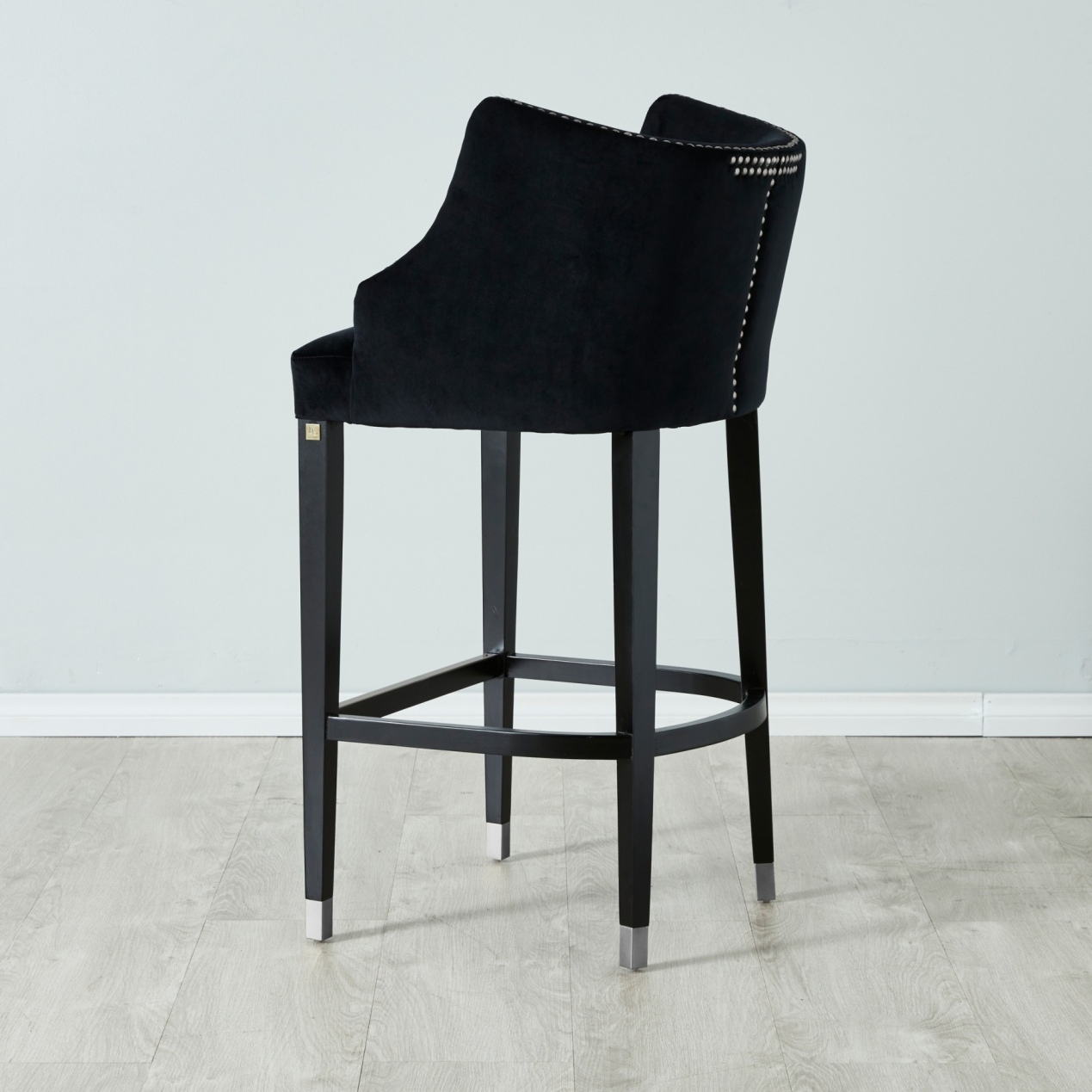 Enhancing the Simone's elegance is a row of silver studs that gracefully dance along its gorgeous curved silhouette. These exquisite details add a touch of refinement and visual interest, elevating the overall aesthetic of the stool. The set of beautifully crafted silver-tipped legs not only provides stability but also adds to the stool's allure. Each leg is meticulously designed to provide balance and support, ensuring a sturdy foundation for your seating experience. To enhance comfort further, the legs are joined together by a thoughtful footrest, providing a convenient and relaxing place to rest your feet.