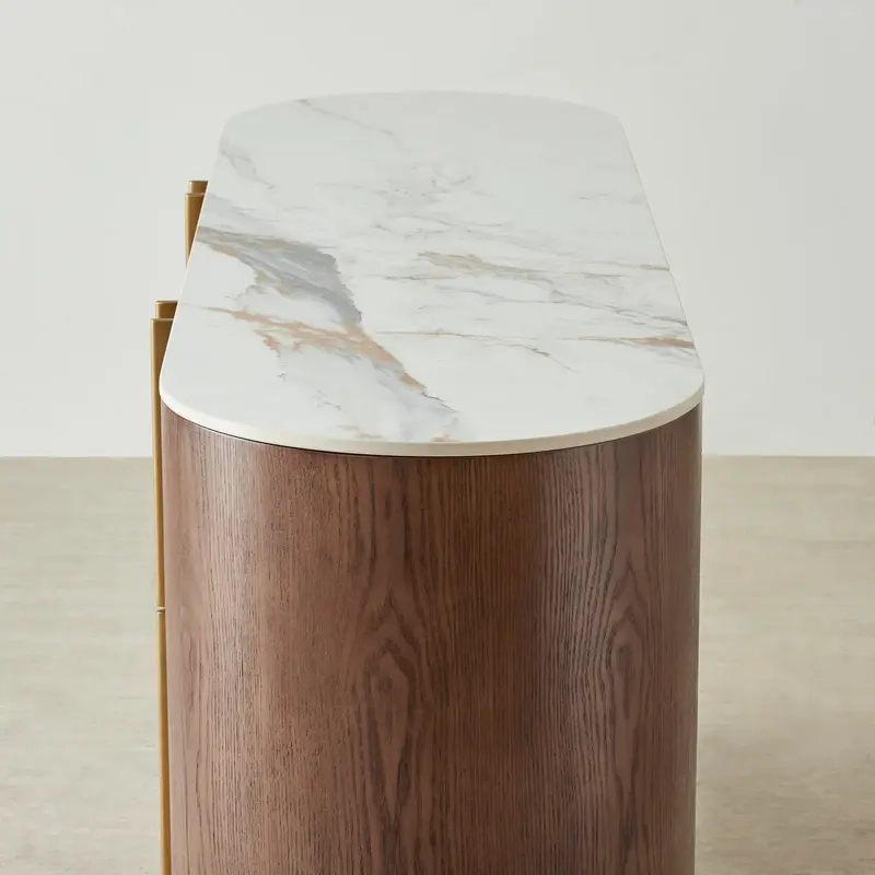 Crowned with a white sintered stone top, the Sir Lionell Dresser brings a stunning, durable surface that feels both modern and timeless. The stone’s smooth finish highlights the dresser’s stylish curved edges, giving the silhouette a sculpted presence.
