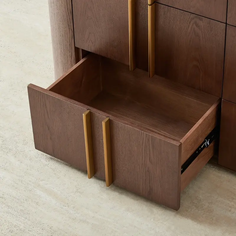 Nine gliding drawers promise easy organization, offering room for clothing, accessories, or daily essentials. Brass-toned handles stand out against the walnut brown wooden base, adding contrast and a warm touch that completes the dresser’s inviting character.
