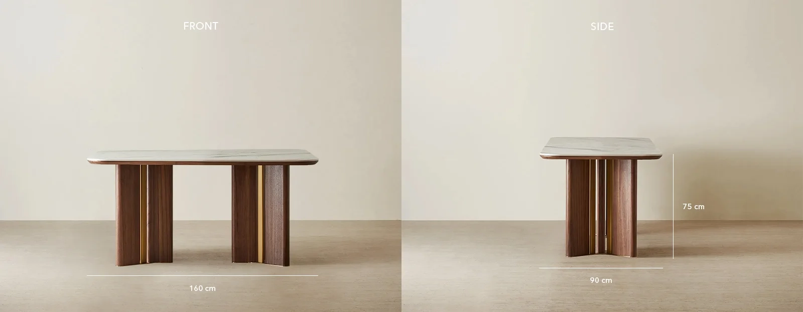 Refined brass accents add a contemporary note, enhancing the natural warmth of the walnut base. The seamless blend of luxurious sintered stone, rich walnut wood, and subtle brass detailing creates a harmonious balance of enduring beauty.