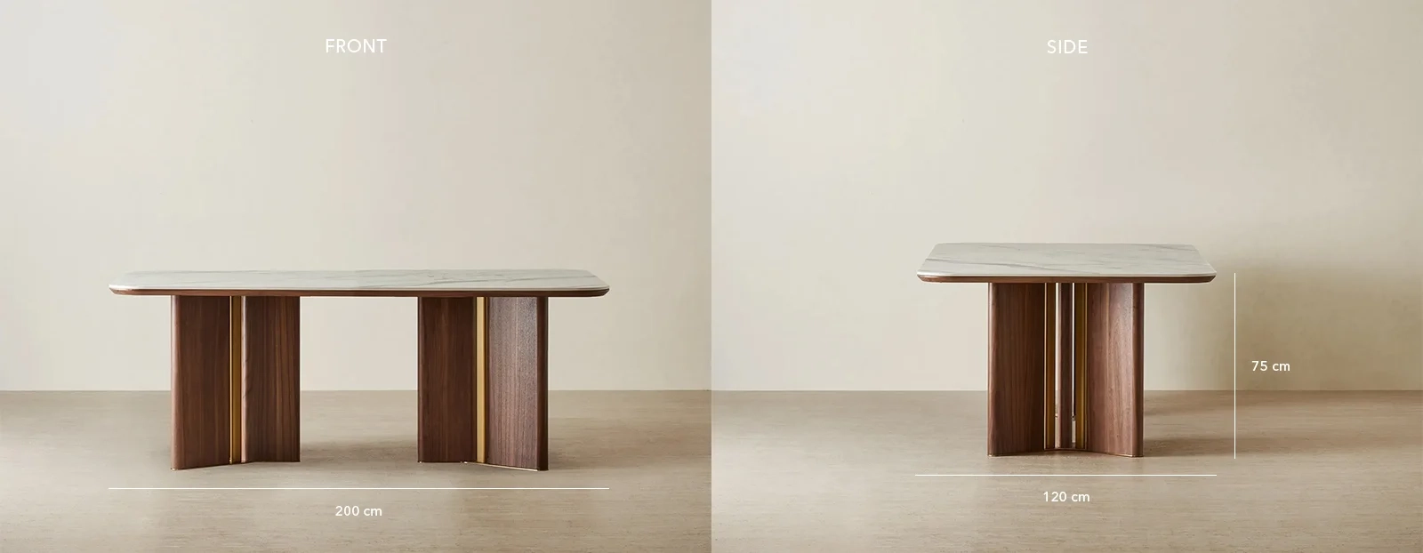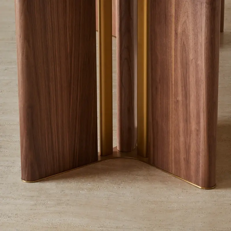 Refined brass accents introduce a contemporary note, enhancing the natural warmth of the walnut base. The seamless blend of luxurious sintered stone, rich walnut wood, and subtle brass detailing delivers a perfect harmony of enduring beauty.