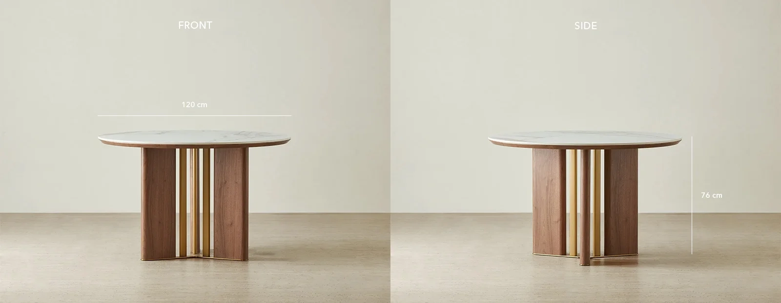 Its sculptural walnut brown wooden base, accented with gold detailing, adds a striking modern edge. Perfect for both casual dining and special occasions, blending style with functional design.