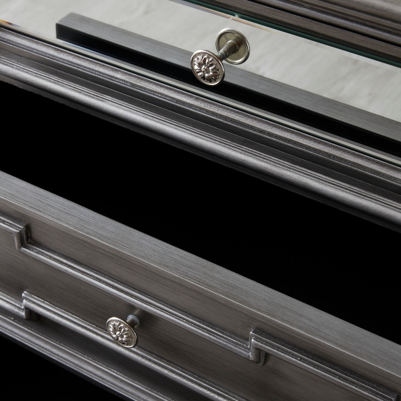 Indulge in the opulence of the Solitude Antique Silver Bedside Table, a true masterpiece that combines the timeless elegance of the Hamptons with the captivating design of art-deco. Crafted with meticulous attention to detail, this bedside table brings undeniable luxury to your bedroom. Made from premium quality materials, the Solitude Bedside Table showcases a stunning shade of silver that exudes sophistication and glamour.