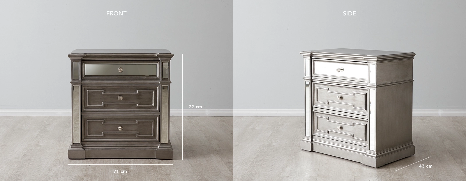 Its allure is further enhanced by the exquisite mirrored panels that adorn each side of the outer frame. These mirrored surfaces reflect light, creating a sense of brightness and adding a touch of grandeur to your space. The Solitude Bedside Table offers practicality and ample storage with three spacious drawers. Each drawer is thoughtfully designed with stylized handles, adding a touch of elegance to the overall aesthetic. Organize your belongings with ease, keeping your bedroom tidy and clutter-free.