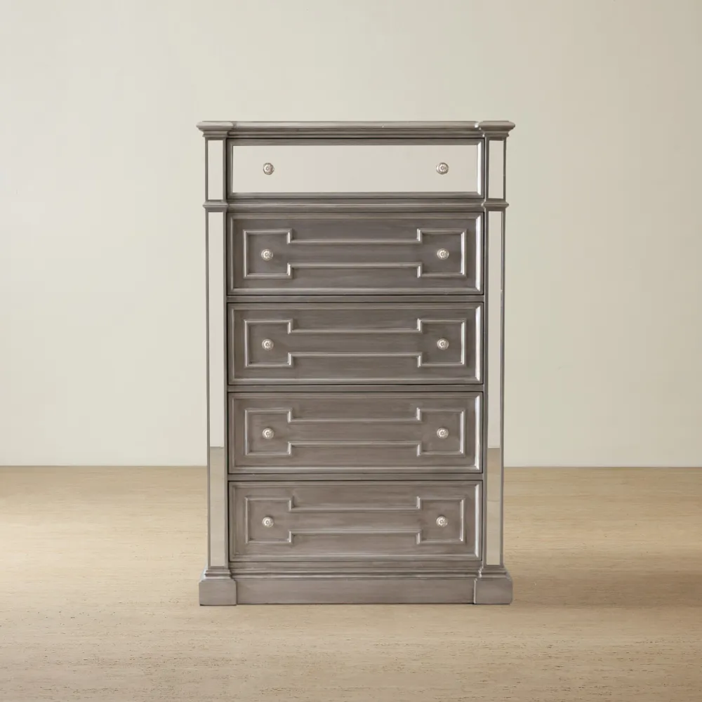 Its allure is further enhanced by the exquisite mirrored panels that adorn each side of the outer frame. These mirrored surfaces reflect light, creating a sense of brightness and adding a touch of grandeur to your space. The Solitude Bedside Table offers practicality and ample storage with three spacious drawers. Each drawer is thoughtfully designed with stylized handles, adding a touch of elegance to the overall aesthetic. Organize your belongings with ease, keeping your bedroom tidy and clutter-free.