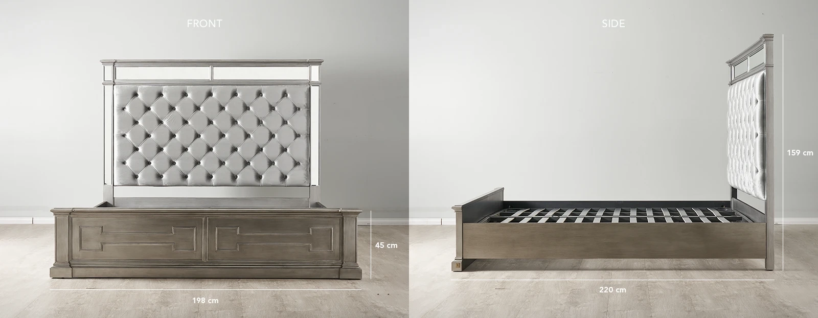 The Solitude Antique Silver King Bed is a timeless piece worthy of your attention. It boasts an Antique Silver coloured Headboard made of sumptuously soft pile velvet with visible tufting that adds charm and luxury to the overall aesthetic. A set of Antique Silver Mirrors encapsulates the gorgeous Headboard to create an extraordinarily eye-catching combination. These mirrors play with the perception of space and add intrigue to the bedroom.