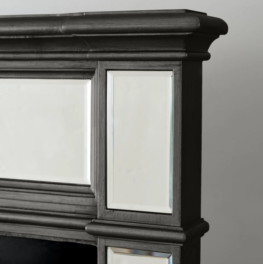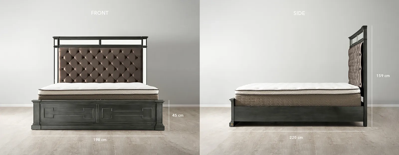 The Solitude Brushed Black King Bed is a timeless piece worthy of your attention. It boasts a dark coloured headboard made of sumptuously soft black velvet with visible tufting that adds charm and luxury to the overall aesthetic. A set of Antique Silver Mirrors encapsulates the striking Headboard, creating an extraordinarily eye-catching combination. These mirrors play with the perception of space and add intrigue to the bedroom.