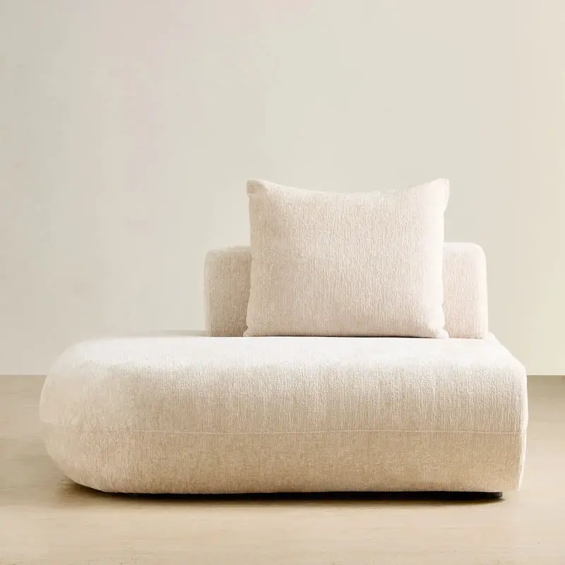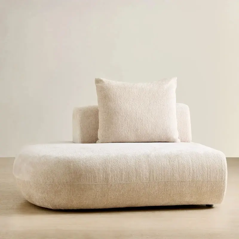 Each Soluna module is wrapped in powder white chenille that adds a soft, textured warmth to its sculpted curves. Oversized foam shaping gives every piece a rounded, modern silhouette that carries the Soluna signature.