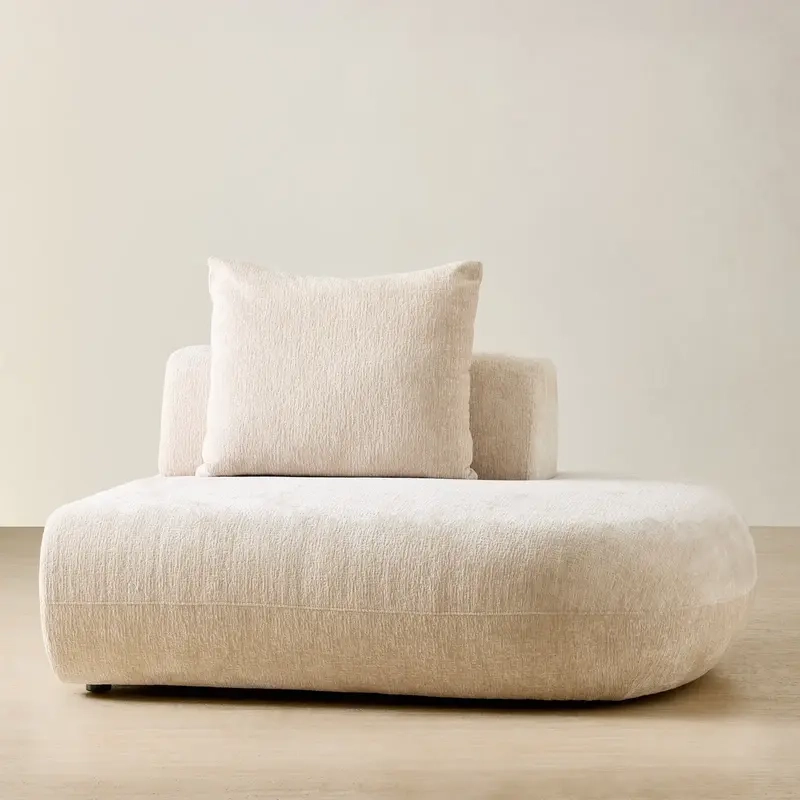 Each Soluna module is wrapped in powder white chenille that adds a soft, textured warmth to its sculpted curves. Oversized foam shaping gives every piece a rounded, modern silhouette that carries the Soluna signature.
