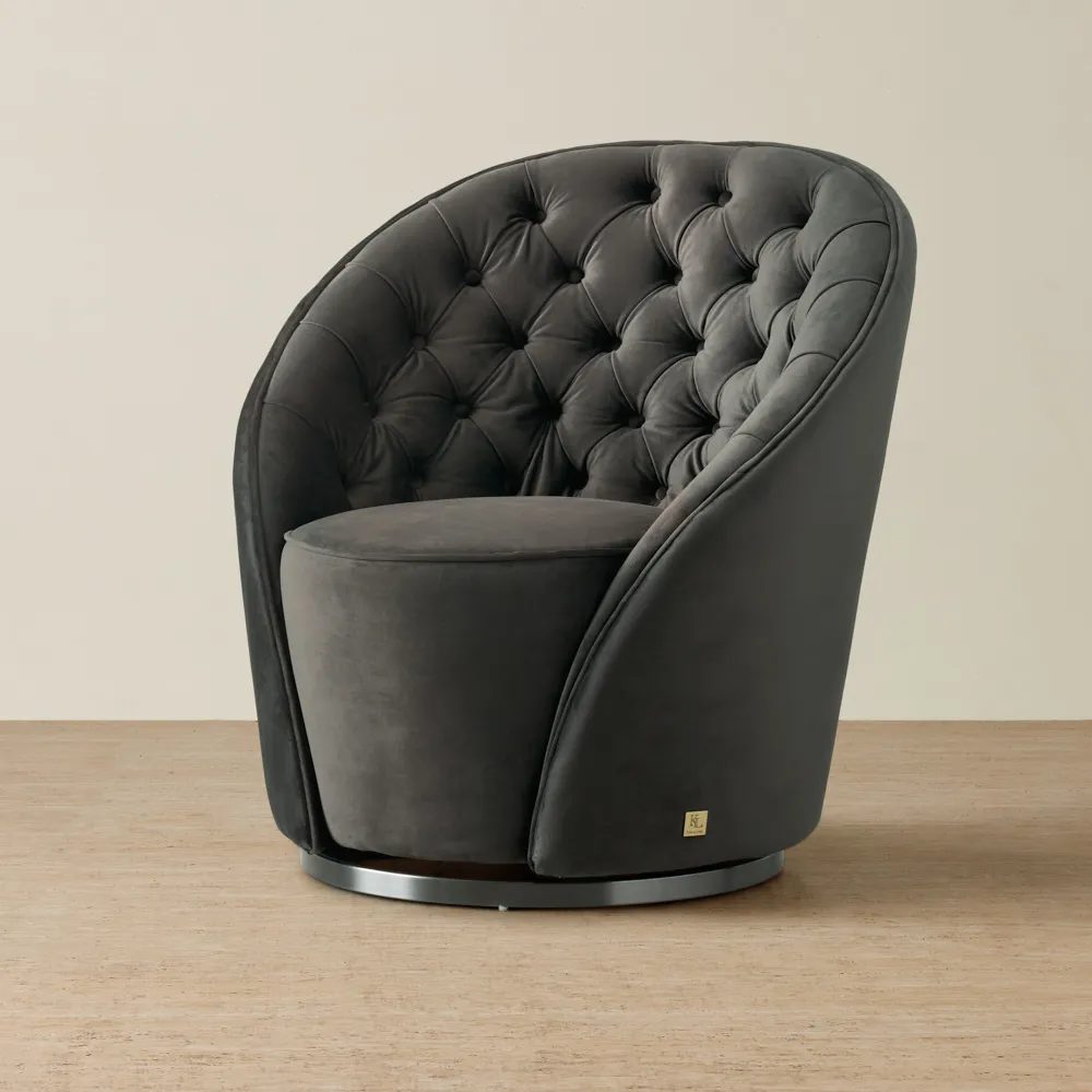 A supremely comfortable plush velvet seat with a diamond-tufted backrest enhances the chair's refined look. Completing the design is a brushed champagne gold stainless steel swivel base, combining style and functionality to suit your needs.