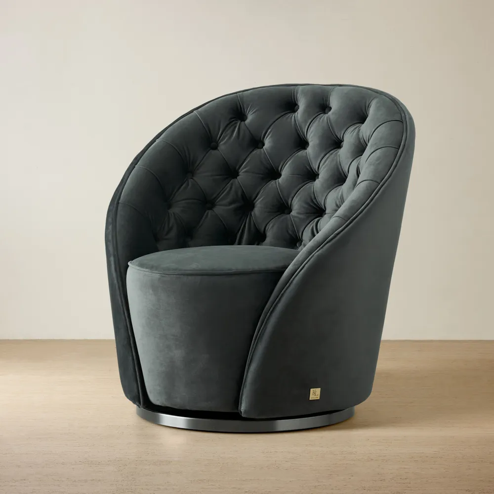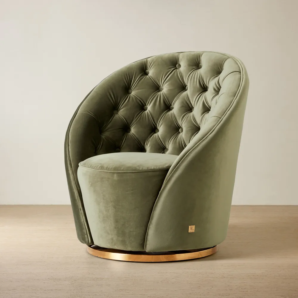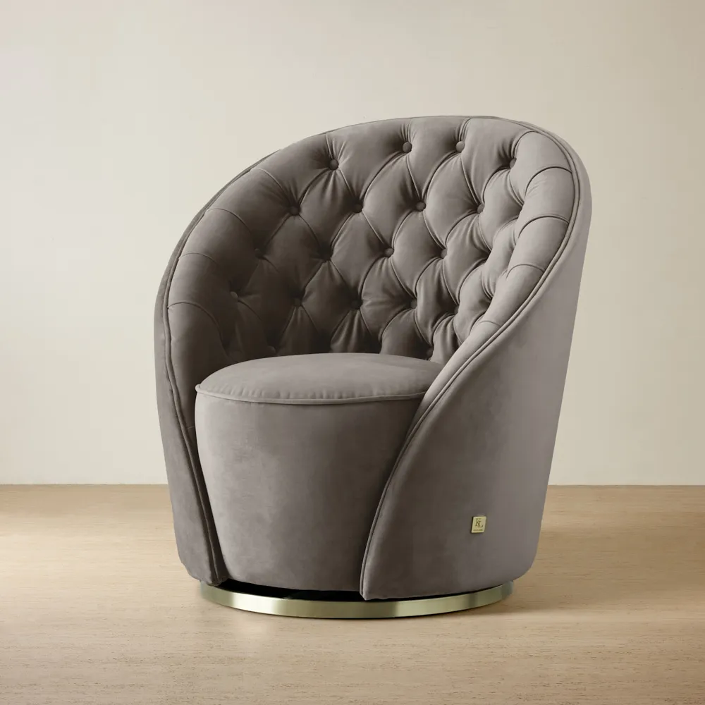 A supremely comfortable plush velvet seat with a diamond-tufted backrest enhances the chair's refined look. Completing the design is a brushed champagne gold stainless steel swivel base, combining style and functionality to suit your needs.