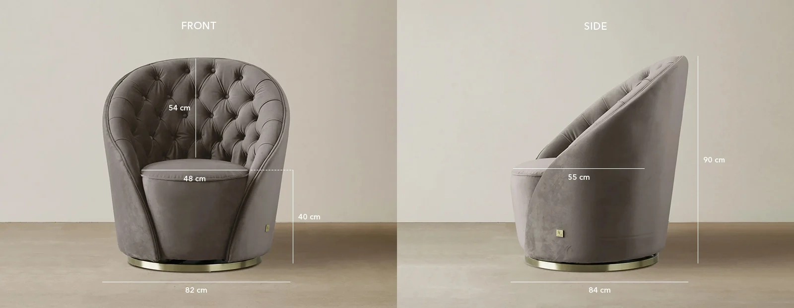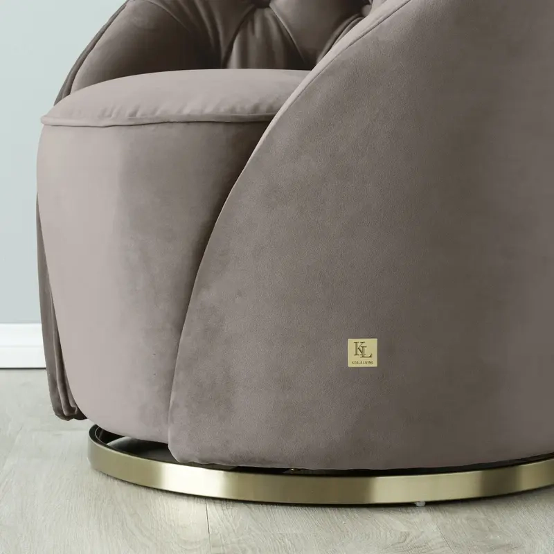Inspired by the classic Tub chair, the Sonja Mushroom Velvet Swivel Occasional Chair reimagines its essential elements for a luxurious lounging experience. Upholstered in premium mushroom velvet, its elegantly curved frame flows seamlessly, resembling a throne.
