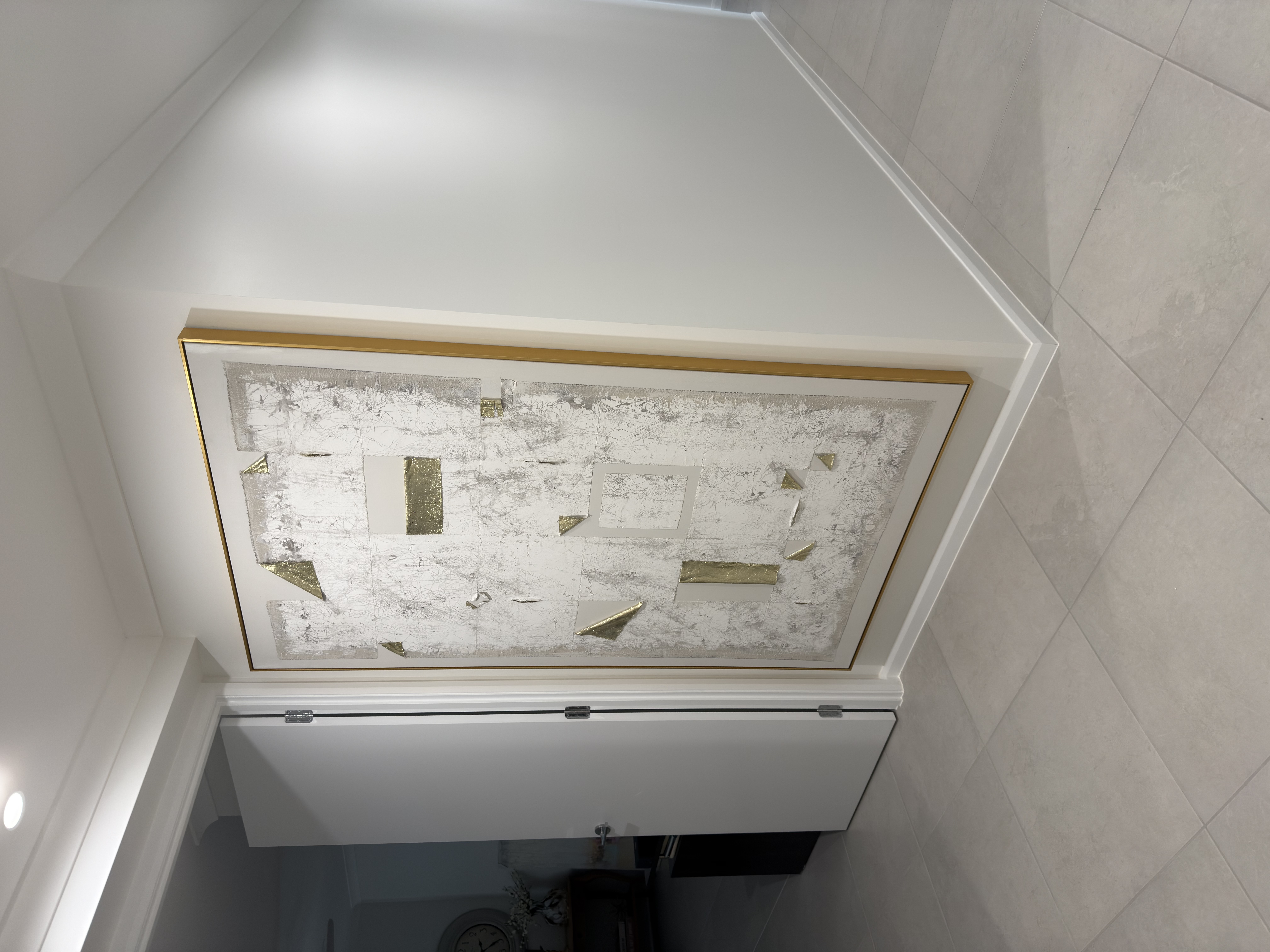 It features sections where the squares exhibit a deliberately peeled-off appearance, revealing a gleaming golden color beneath the serene whites. Intriguingly, the sections with a peeled-off look invite a deeper reflection on the concept of layers and revelations.