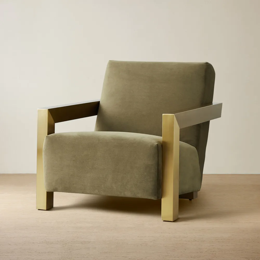 It features chic beige velvet upholstery paired with sleek, golden-coloured stainless steel armrests, adding a contemporary touch. The luxurious combination of fabric and metal creates a stylish and modern aesthetic, enhancing any space.