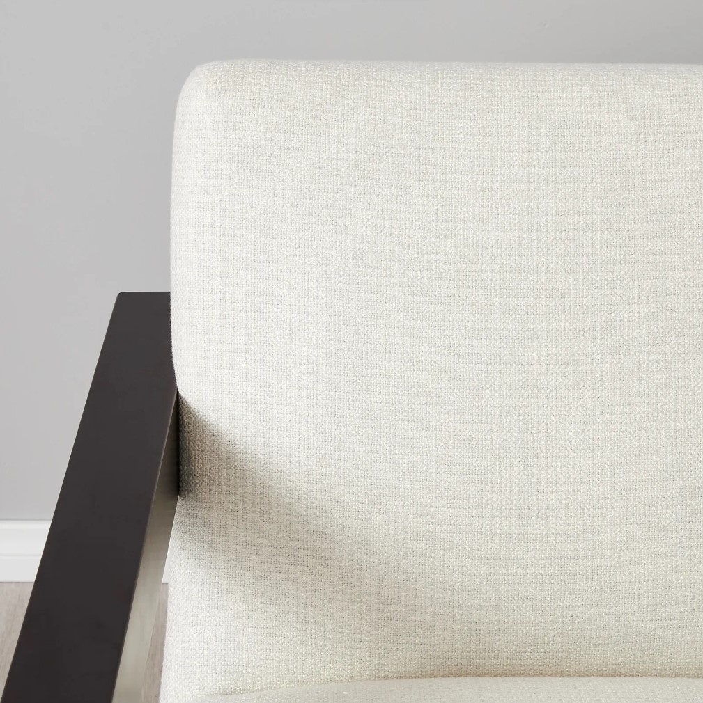 It features sophisticated chestnut white woven fabric upholstery paired with sleek Espresso Brown Wooden Legs, adding a contemporary touch. The luxurious combination of fabric and wood creates a stylish and modern aesthetic, enhancing any space.