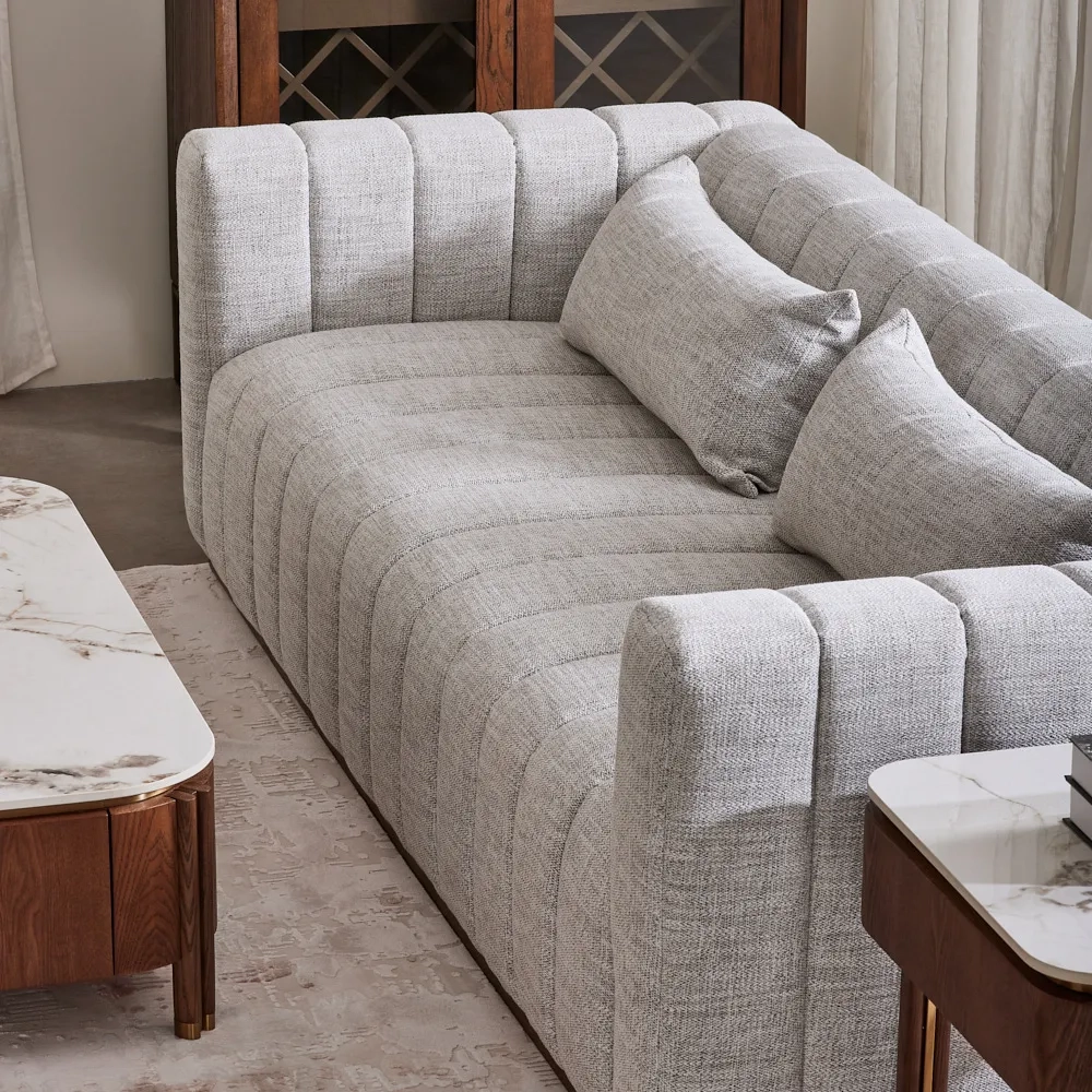 The Storme Murmur White Fabric 2-Seater Sofa adds an inviting touch to your living area with its classic tuxedo design wrapped in contemporary fabric. Enveloped in high-density foam, it offers a cocoon of comfort