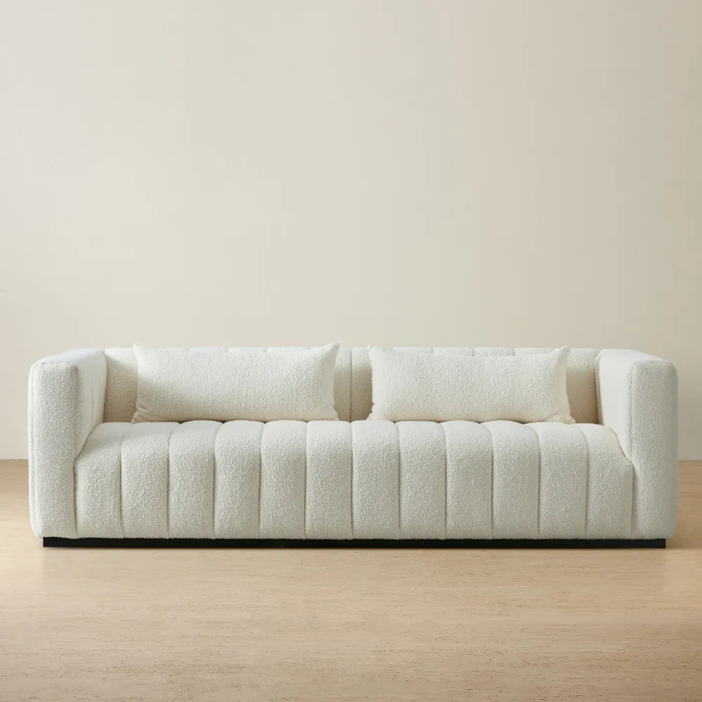 The Storme is adorned with vertical tufts, creating a plush and elegant appearance. Its calming white tones add a serene aesthetic, making it an ideal centerpiece for the busier areas of your home.