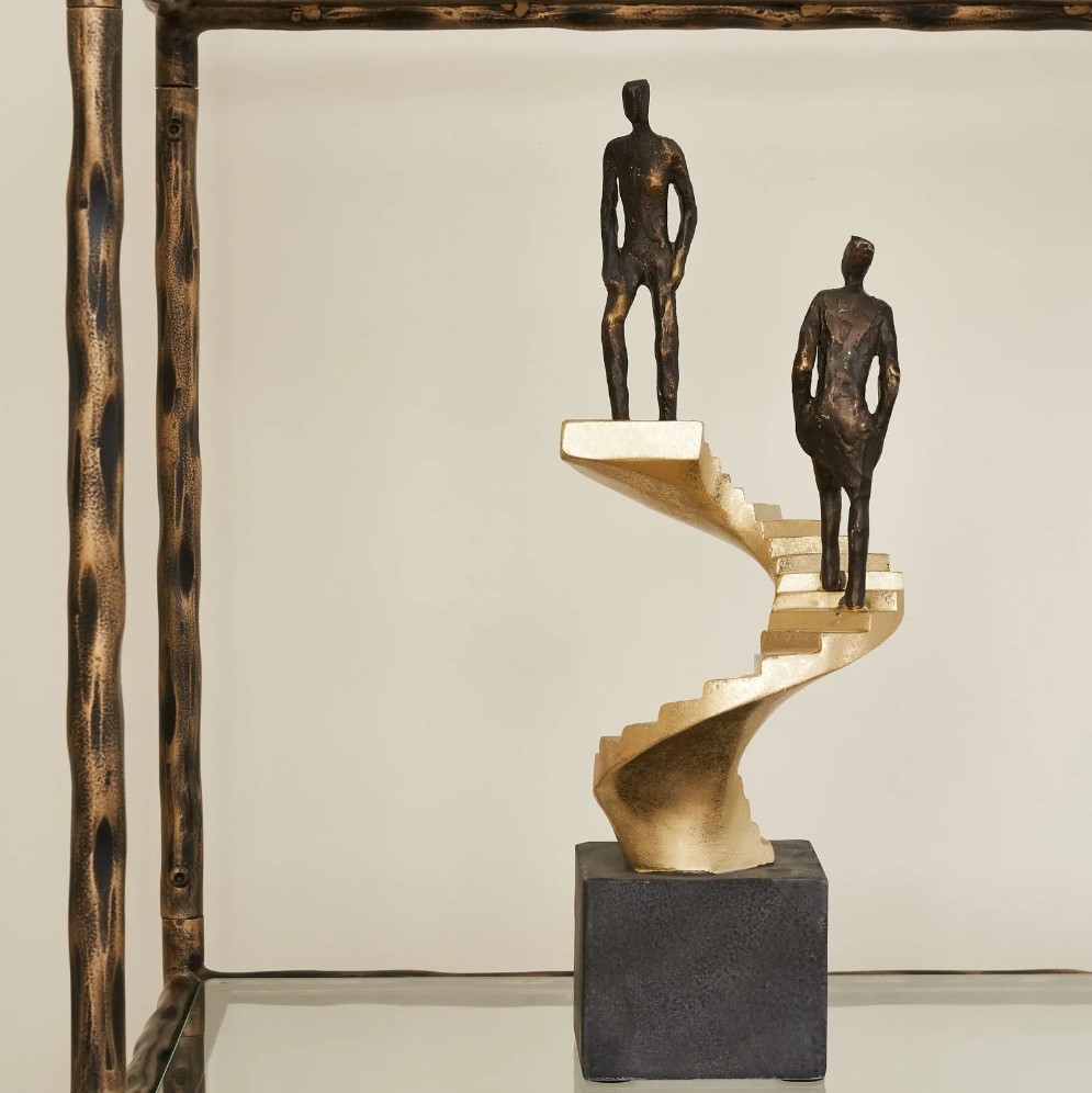 The Strive Gold Resin Decorative is not just a mere decorative piece; it's a compelling narrative in physical form. Crafted meticulously from high-quality resin, this artistic creation portrays two sculpted silhouettes, each painstakingly detailed, as they ascend a spiraling golden staircase.
