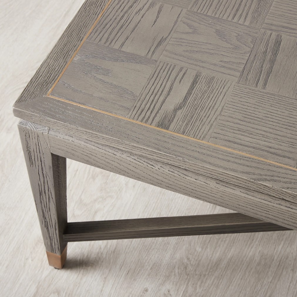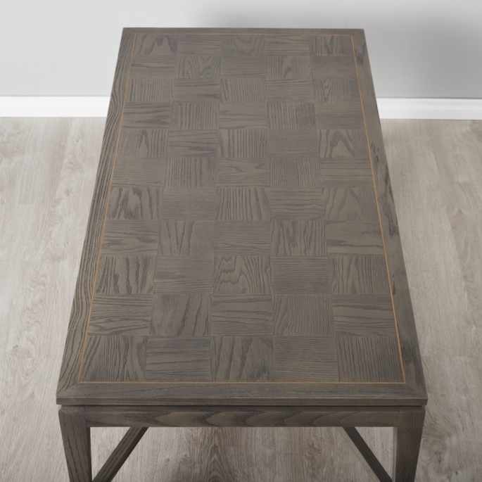 The Tanya Taupe Wooden Coffee Table combines modern rustic style with classic design, featuring a high-quality oak and veneer frame. Its checkered veneer tabletop and golden-coloured border add unique detail and elegance to any living room.