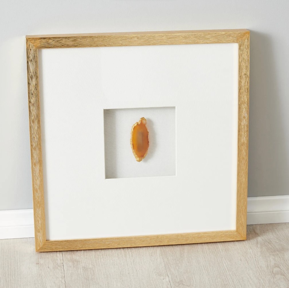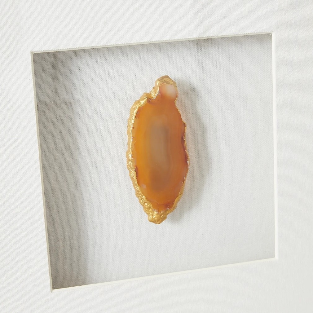 The Terra Brown Agate Shadow Box with Gold Frame is a perfect blend of modern design and natural elegance. Encased within a sleek gold frame is a single piece of agate, showcasing a mesmerizing interplay of gold and brown, almost orange, hues.