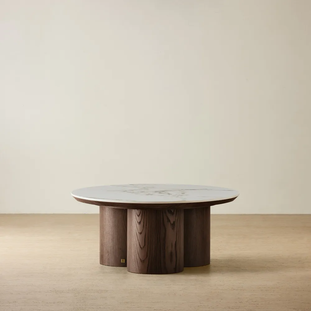 The Terzetto Coffee Table features a sintered stone top with soft, organic veining that draws the eye. Its round shape encourages a flow and makes it easy to gather around.