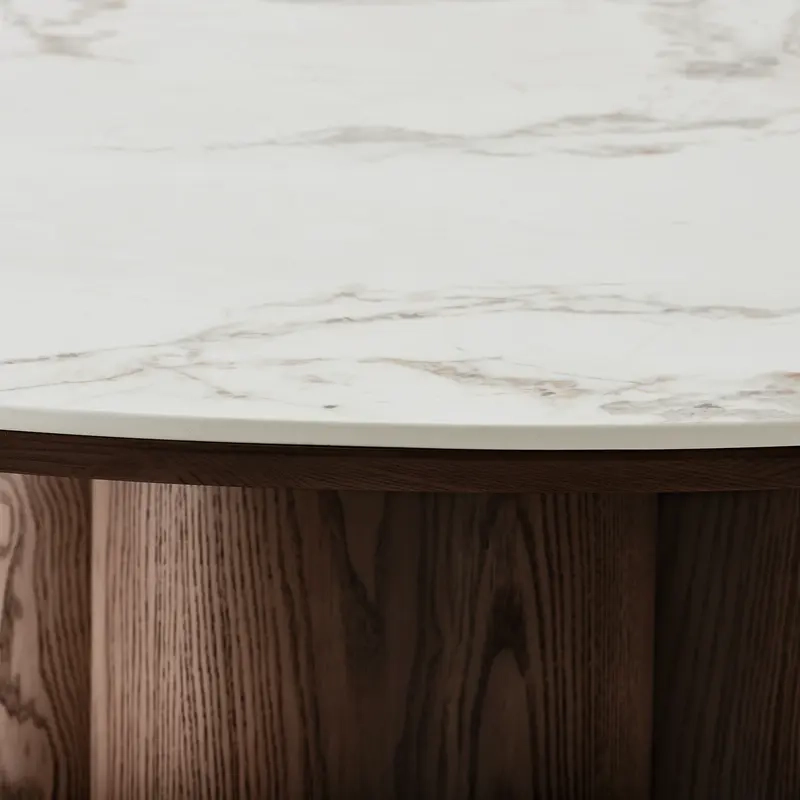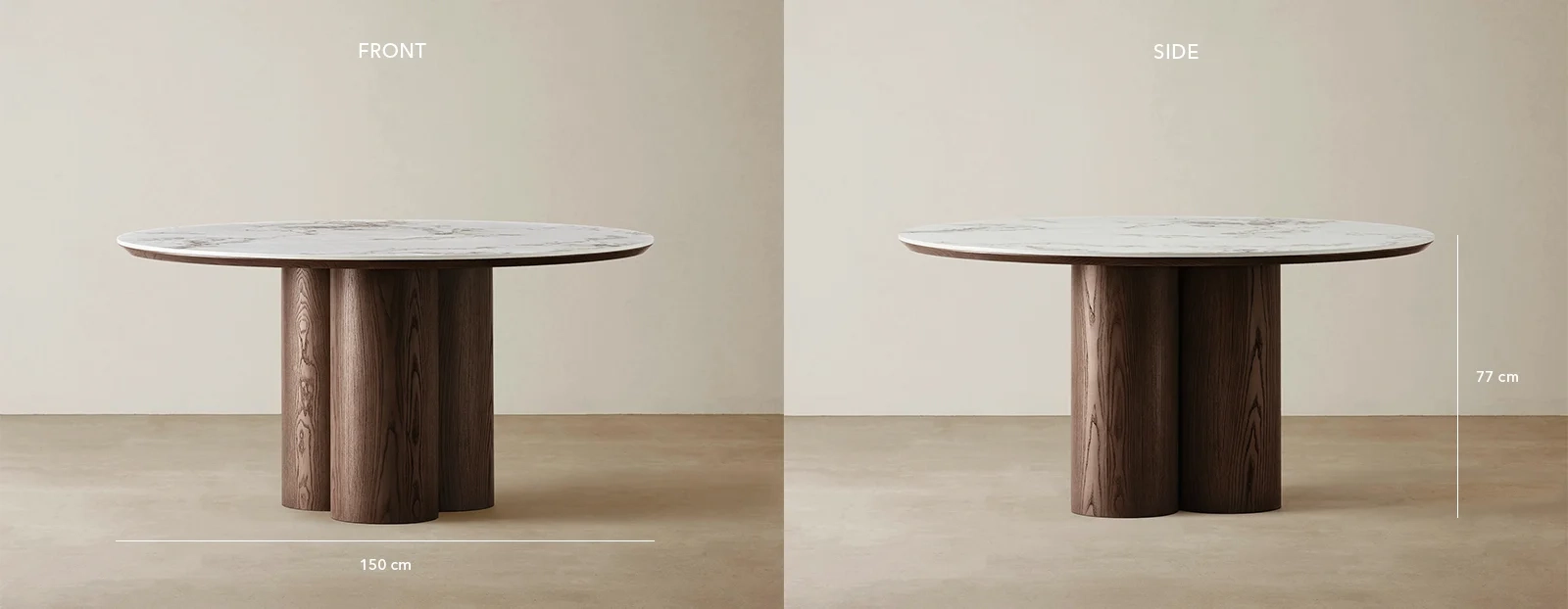 Supported by three solid cylindrical wood columns in a warm Dark Brown Ash finish, the table combines a contemporary twist with traditional craftsmanship. This sturdy yet stylish foundation ensures stability and balance, making it an inviting centerpiece.