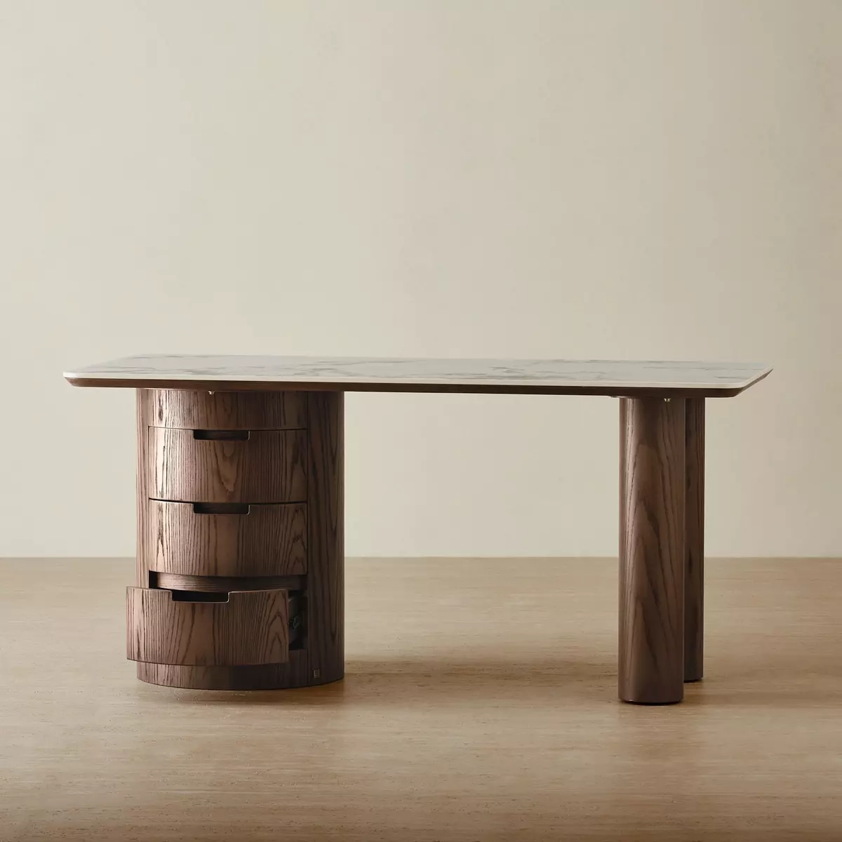 Sintered Stone Luxury The Terzetto Desk blends style and function with a luxurious sintered stone tabletop featuring subtle marbled patterns. Supported by dark-brown cylindrical wood columns, it adds natural warmth and modern elegance to any space.