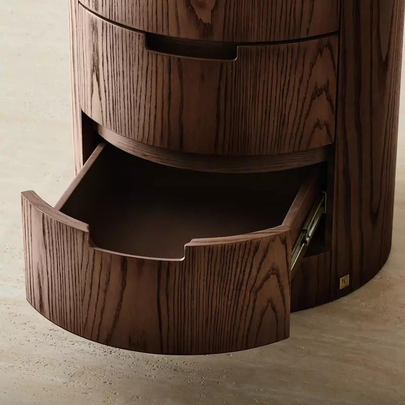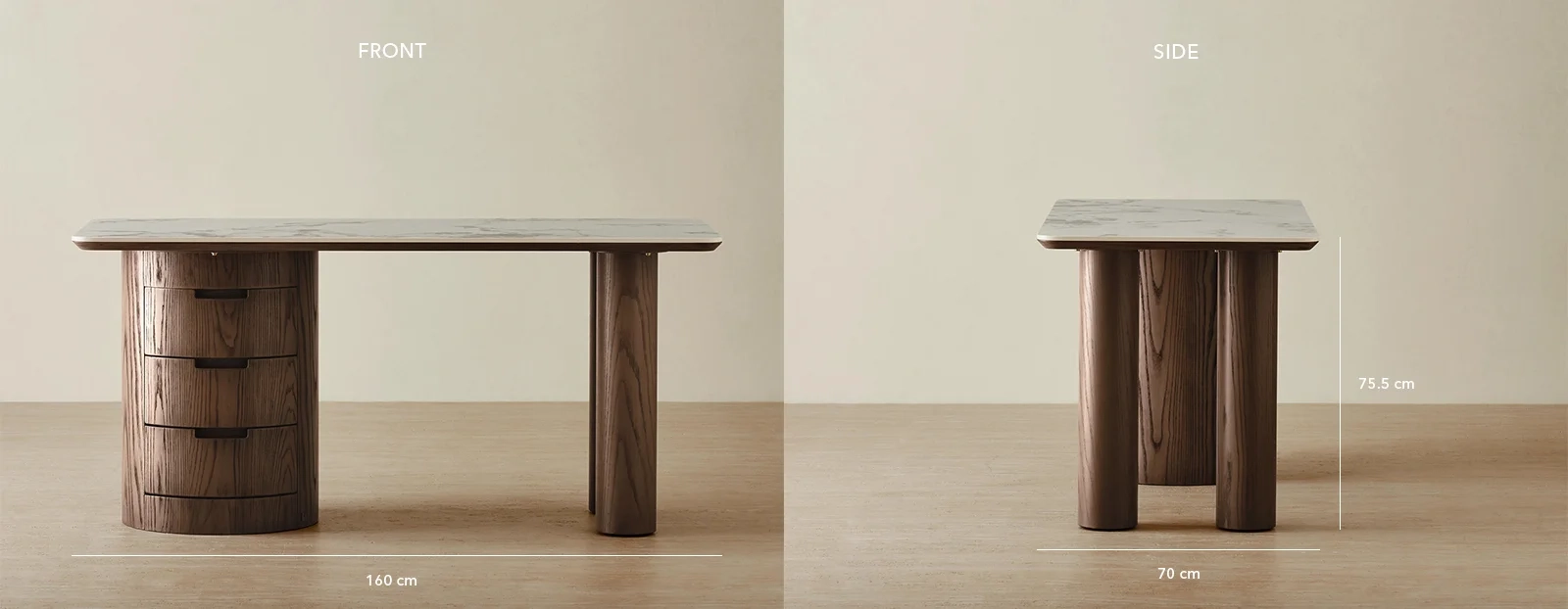 Its integrated storage solution, with gracefully curved drawers built into one of the columns, blends practicality with a minimalist aesthetic. With smooth finishes and rounded edges, the Terzetto Desk enhances any workspace with its balance of elegance and functionality.